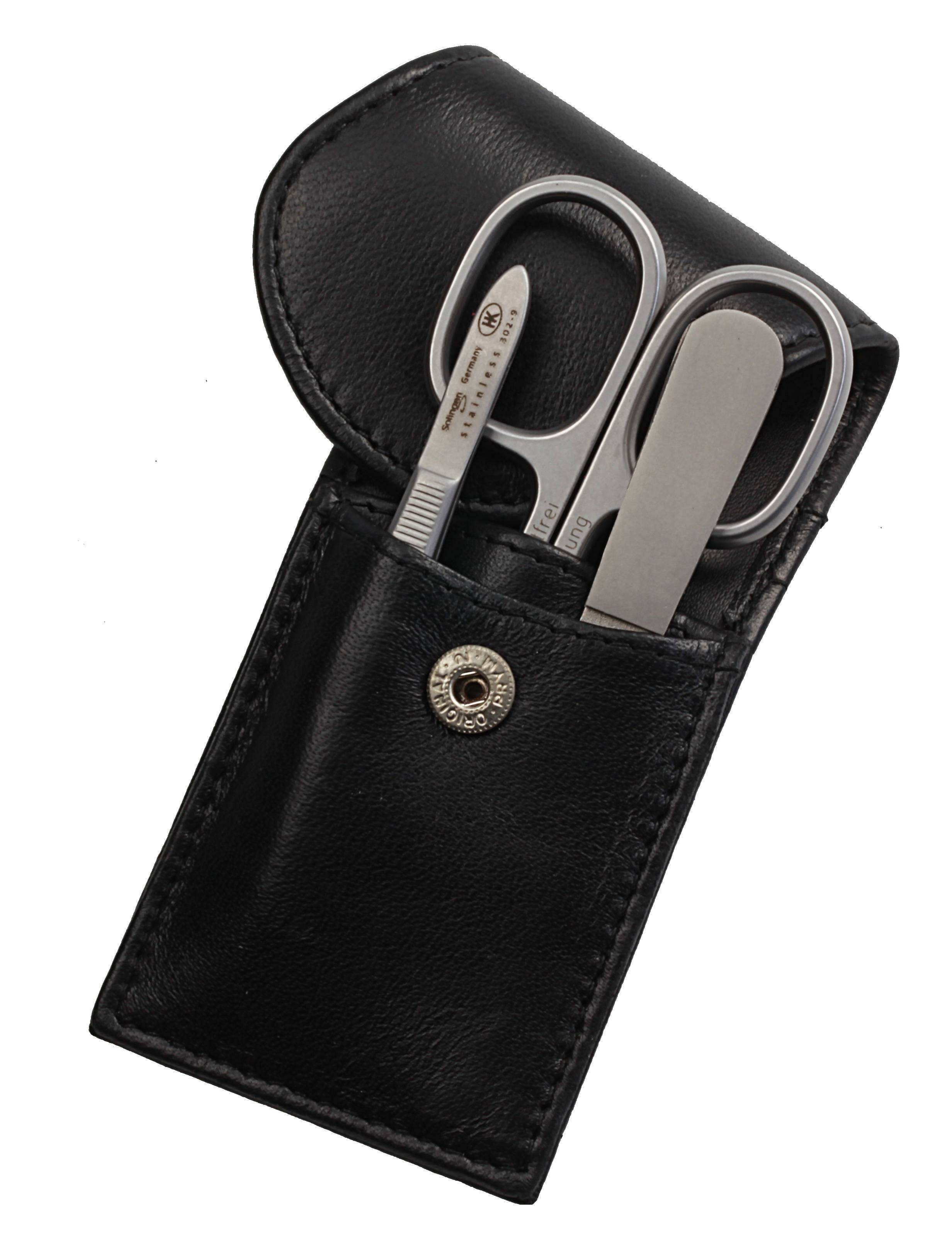 Product information "pocket sized manicure set: 3 implements, stainless steel, matte finish; nappa lamb leather, black"