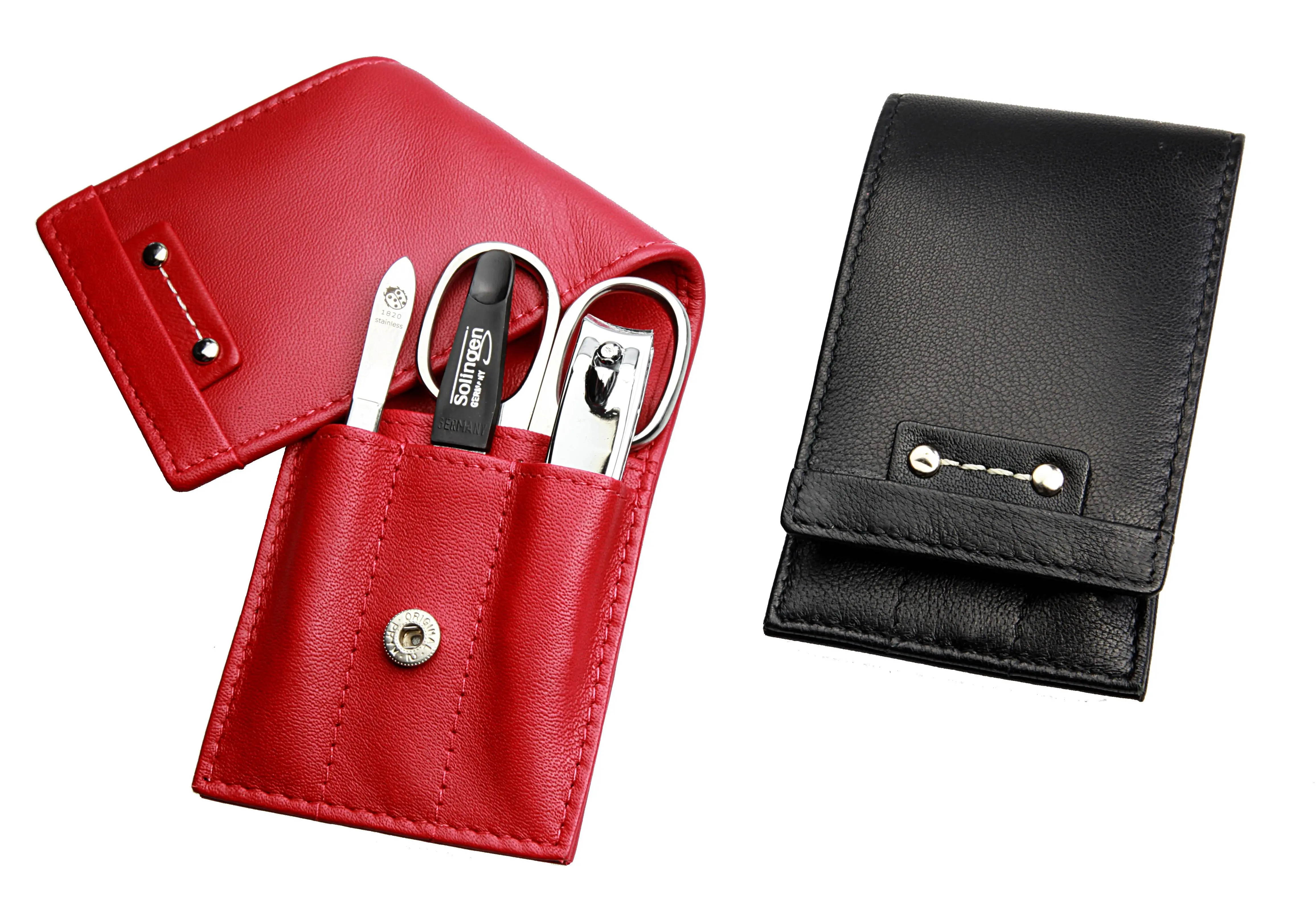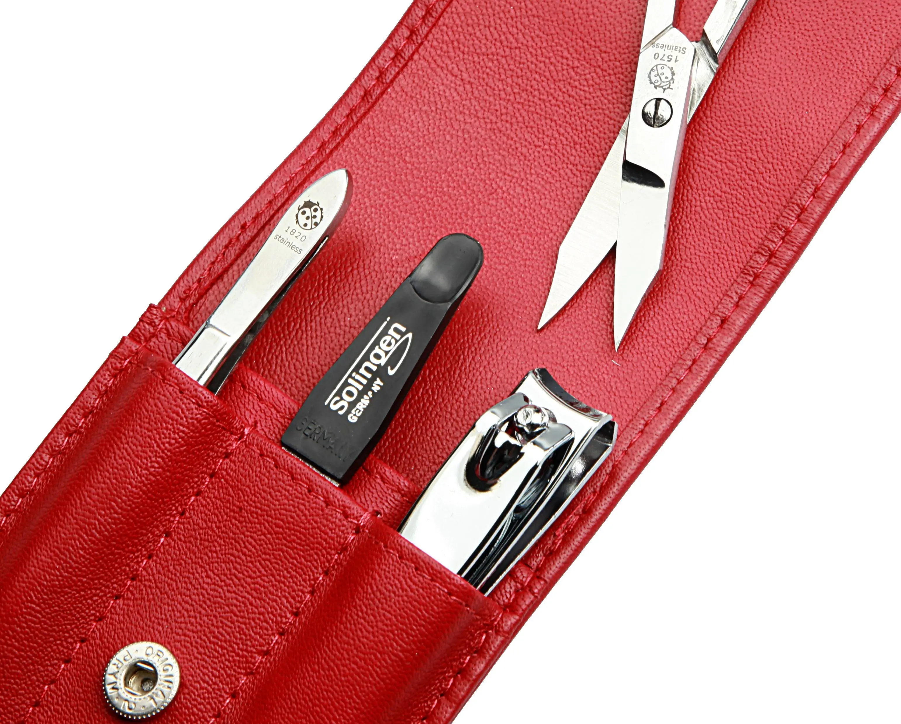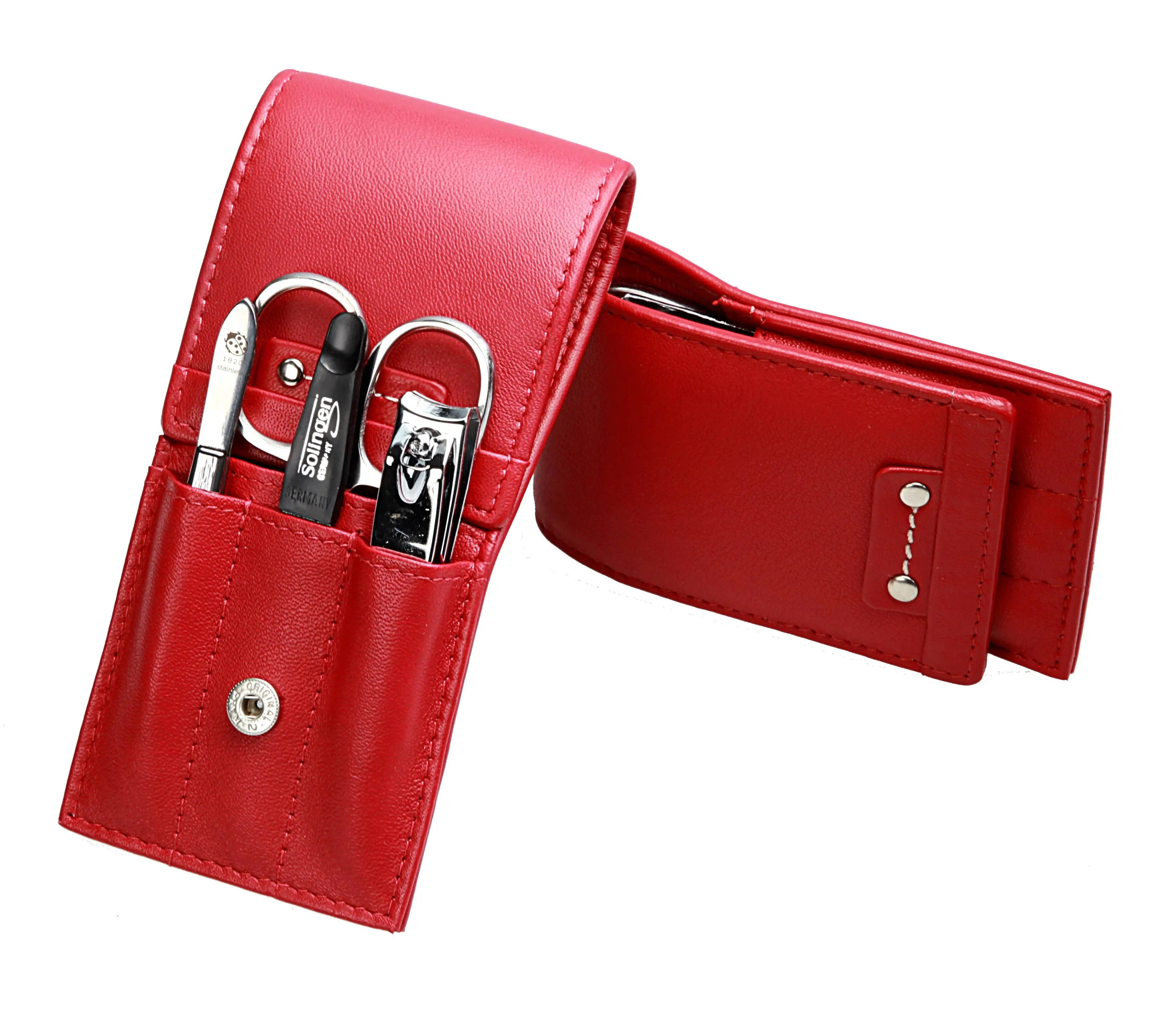 pocket sized manicure set: 4 implements, stainless steel, mirror polished; nappa lambskin, red
