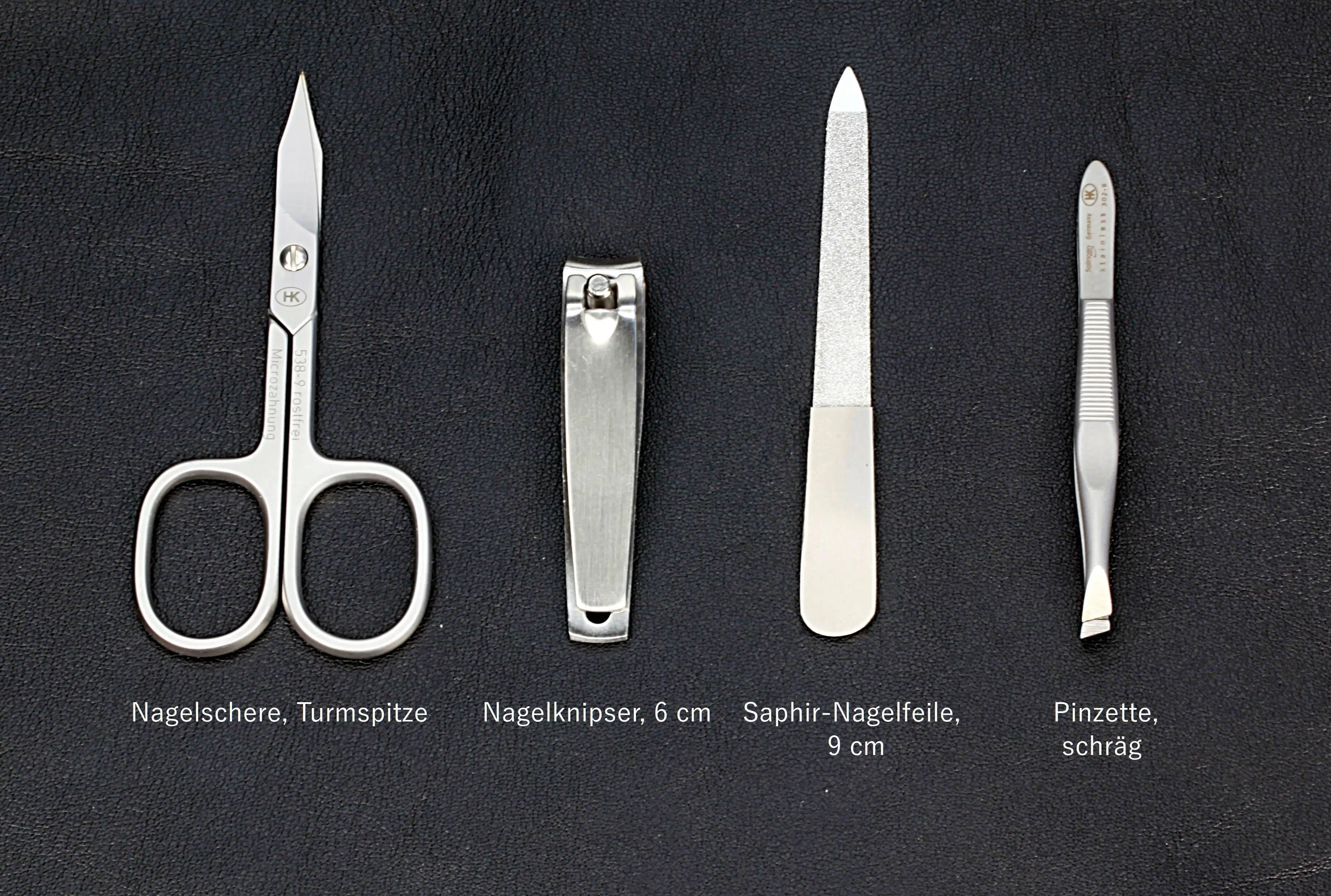 Product information "pocket sized manicure set: 4 implements, stainless steel with mat finish; nappa goat leather, black"