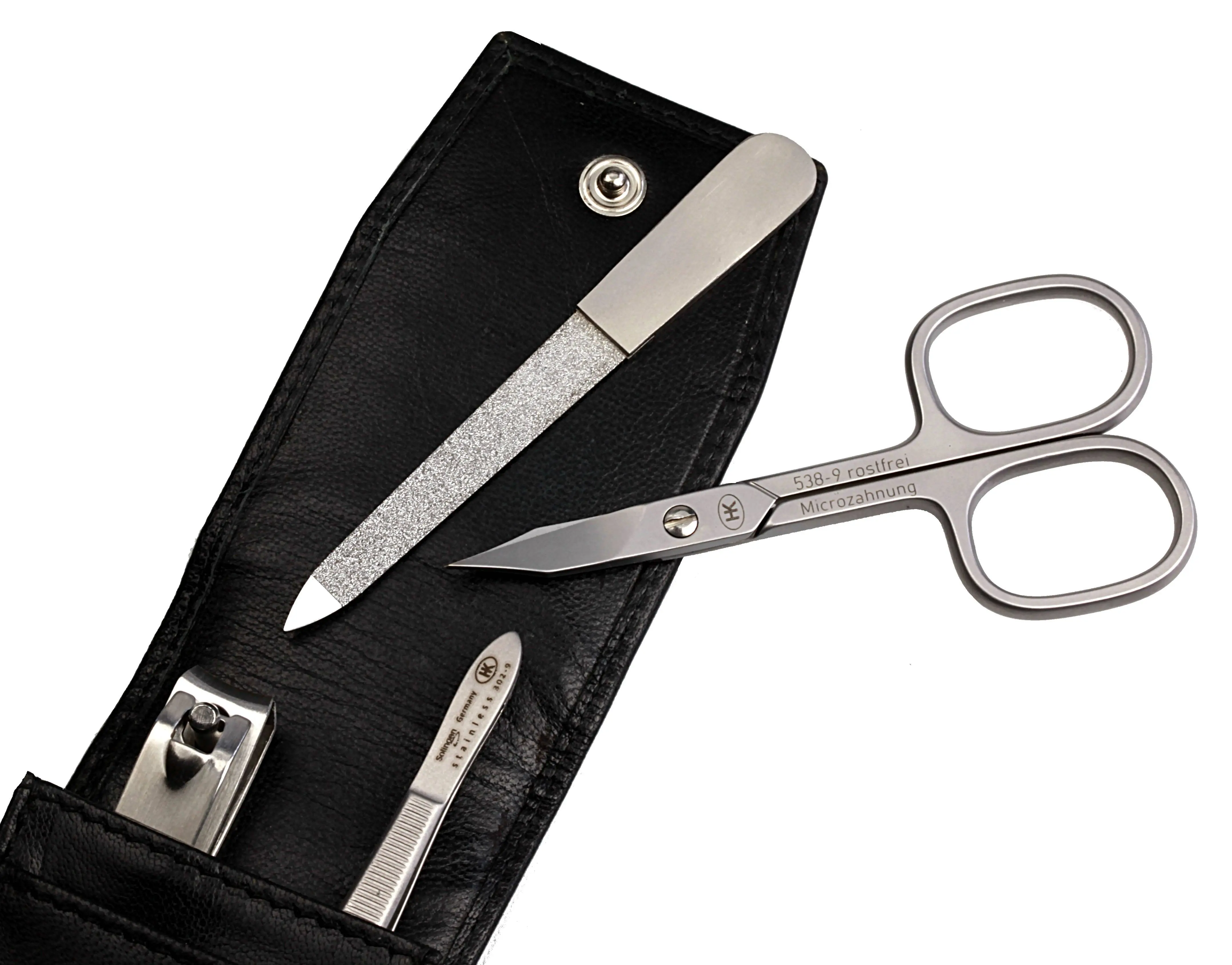 pocket sized manicure set: 4 implements, stainless steel with mat finish; nappa goat leather, black