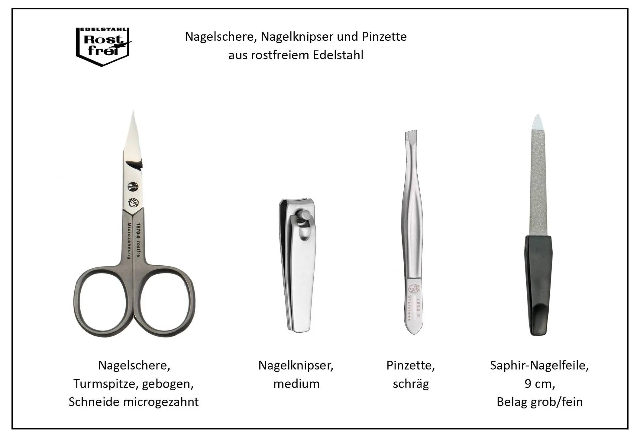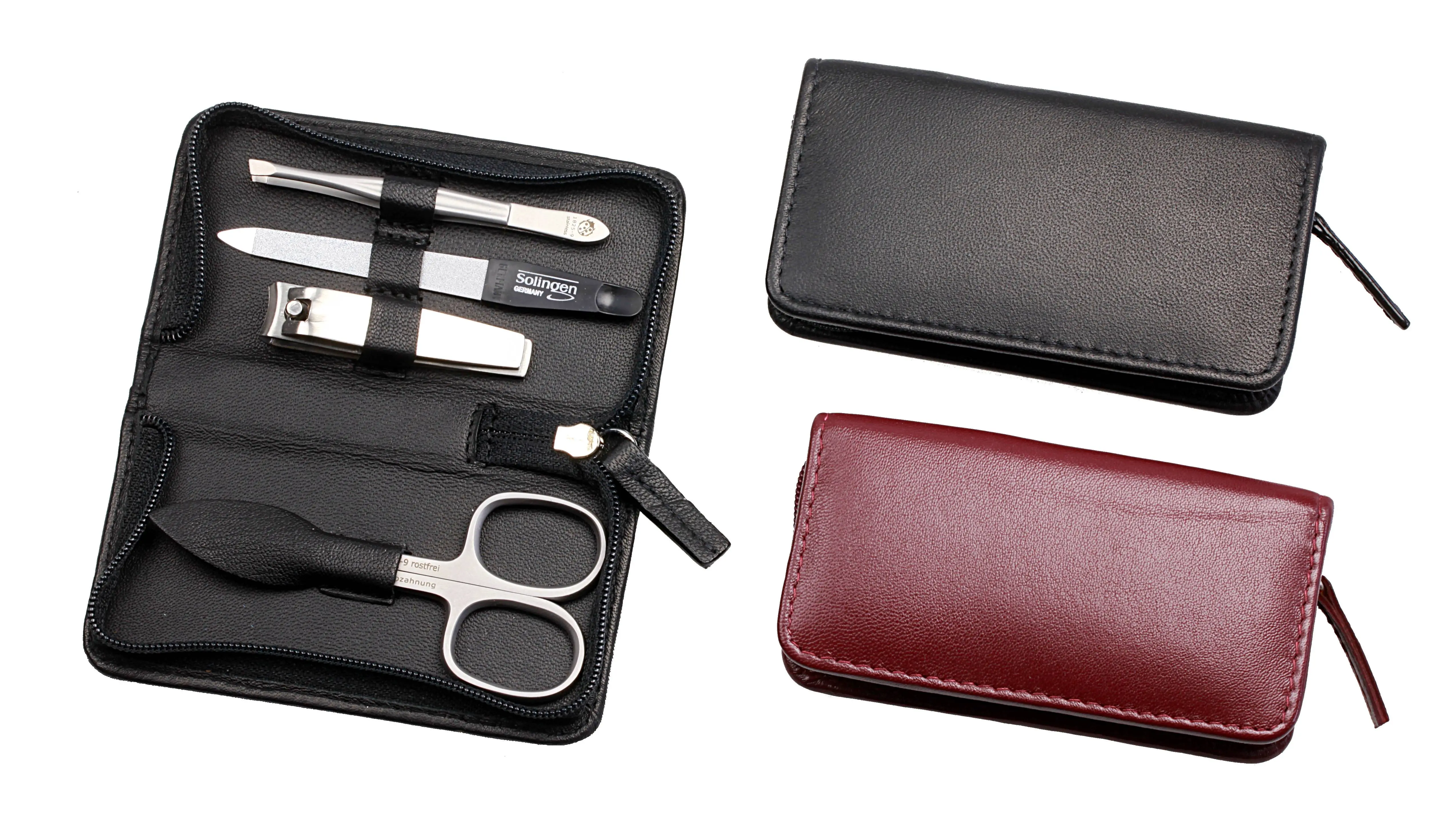 This zipper case is a true classic of our collection: With attention to everly little detail it is skillfully crafted from supple, black nappa lambskin. Simple in design and compact in size, its "inner values" are absolutely conpelling, as all four fine SONNENSCHEIN nailcare instruments are precisely made of stainless steel and come with a mat finish:
