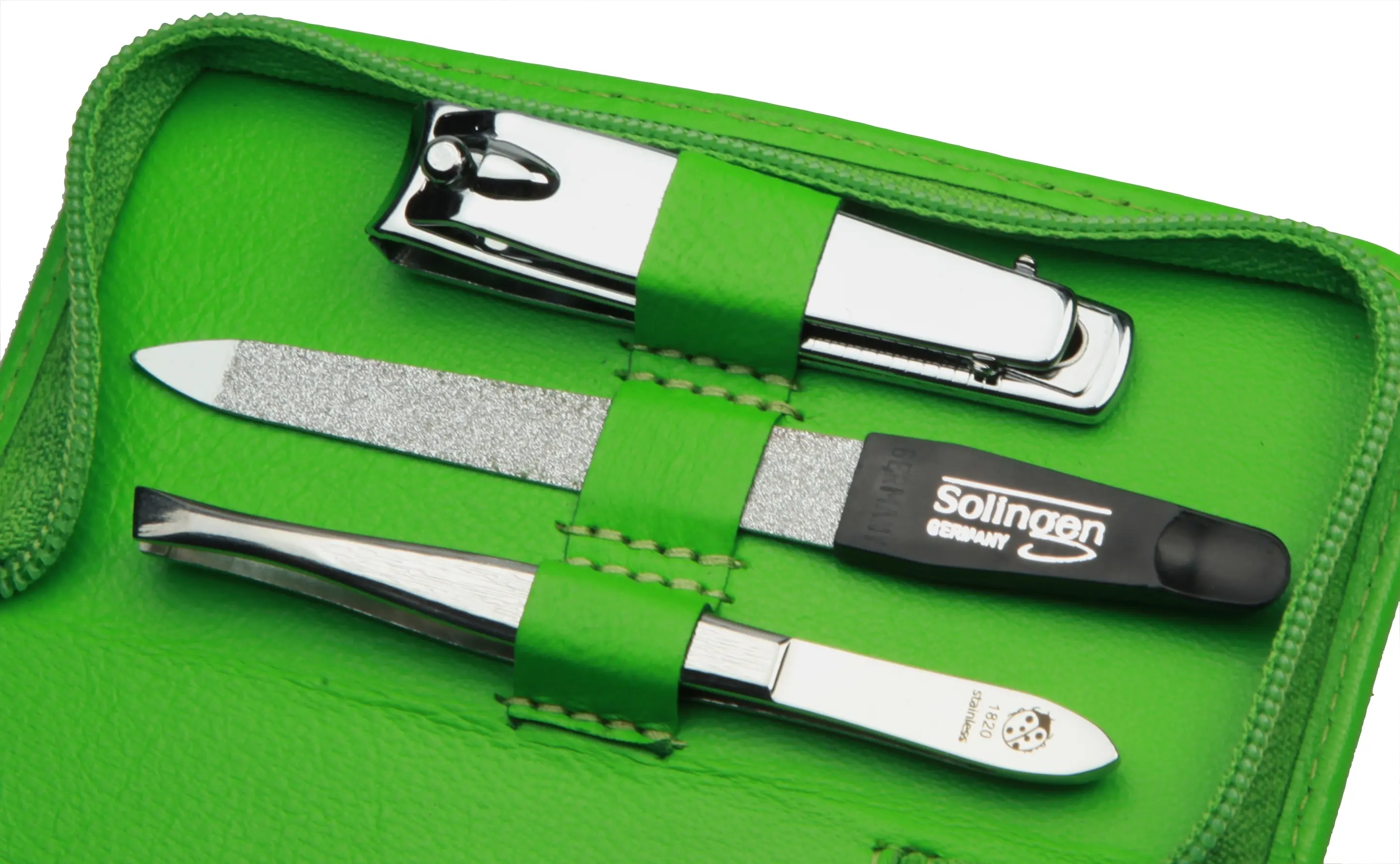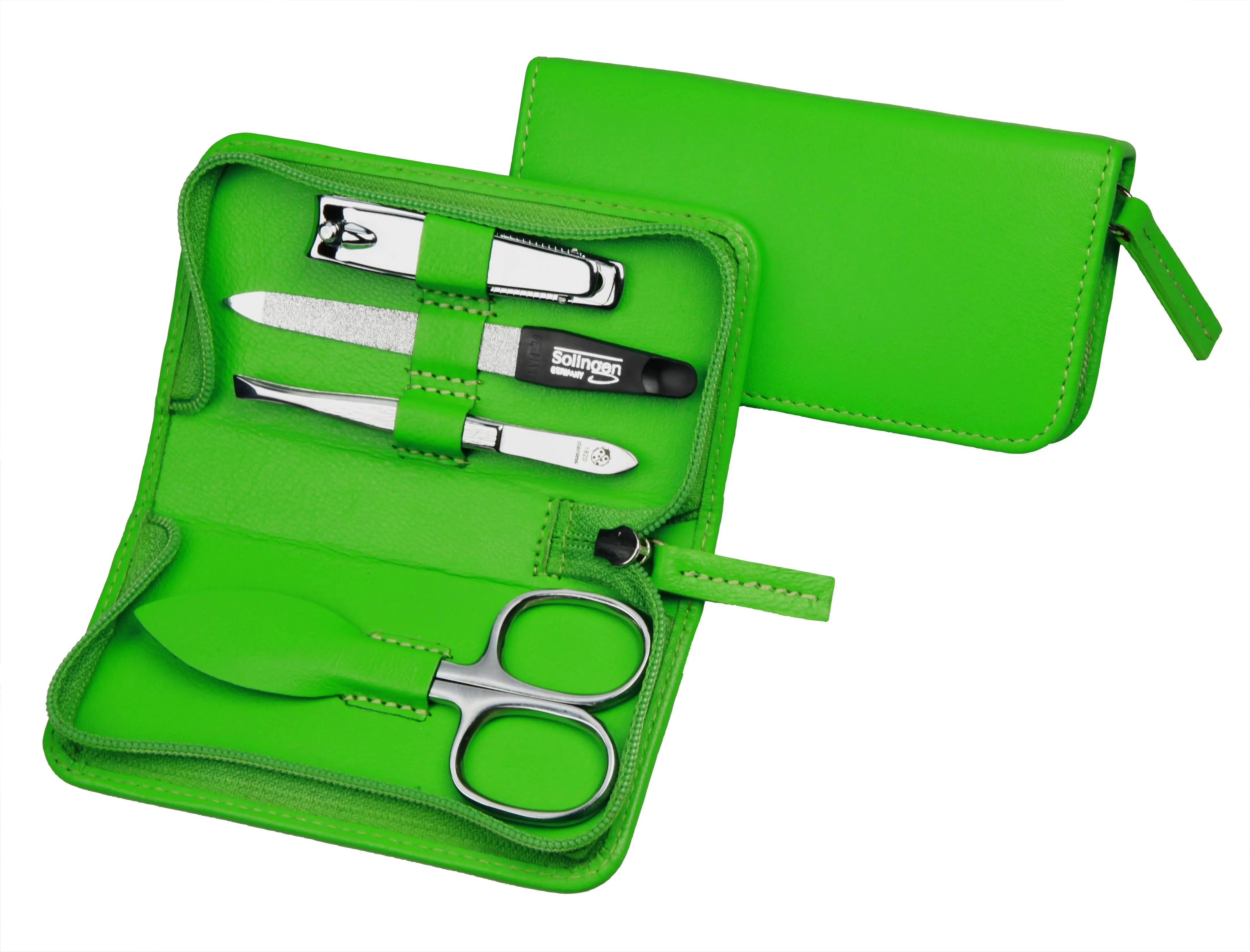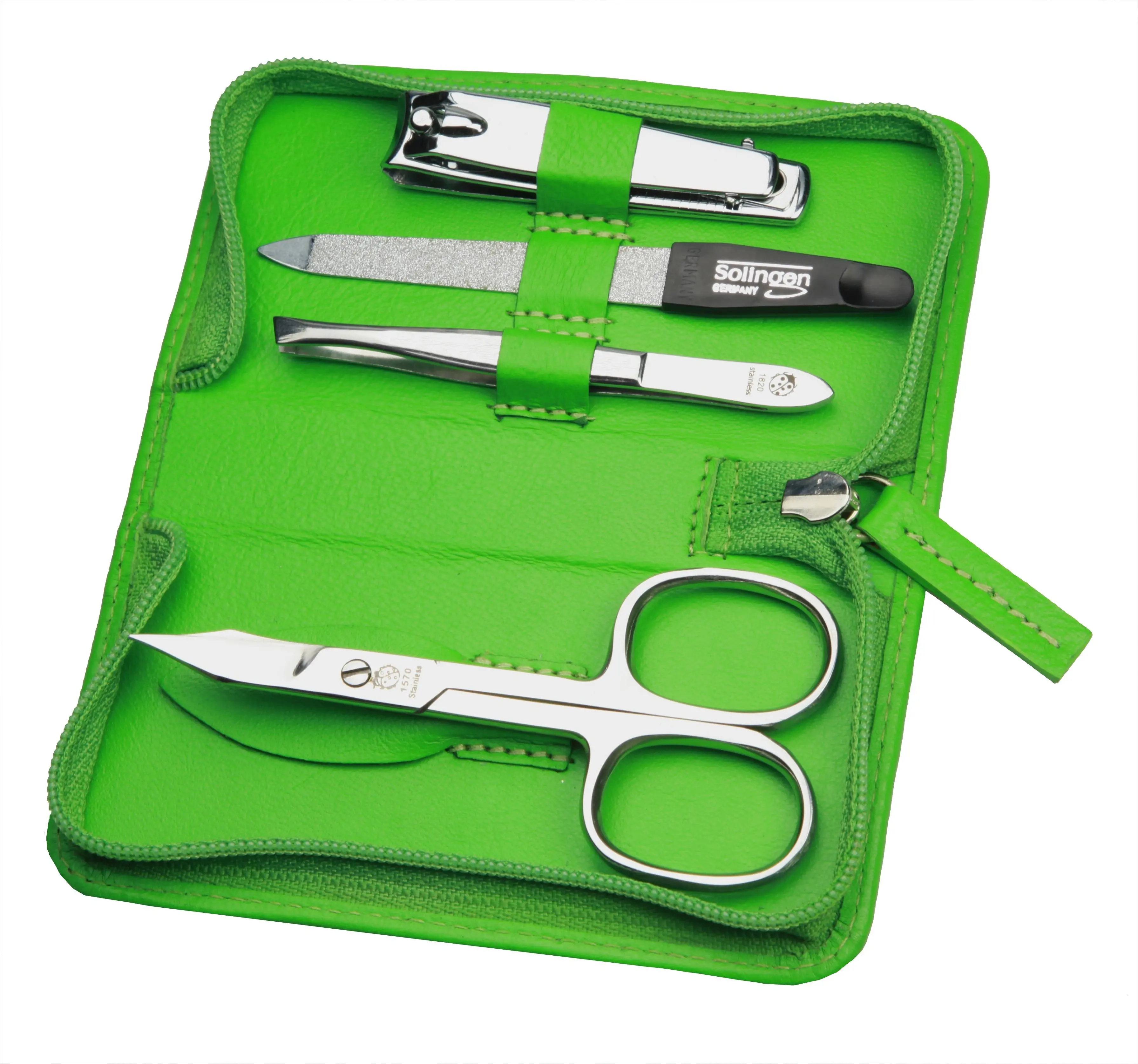 zippered manicure set: 4 implements, stainless steel, mirror-polished; nappa lambskin, apple green