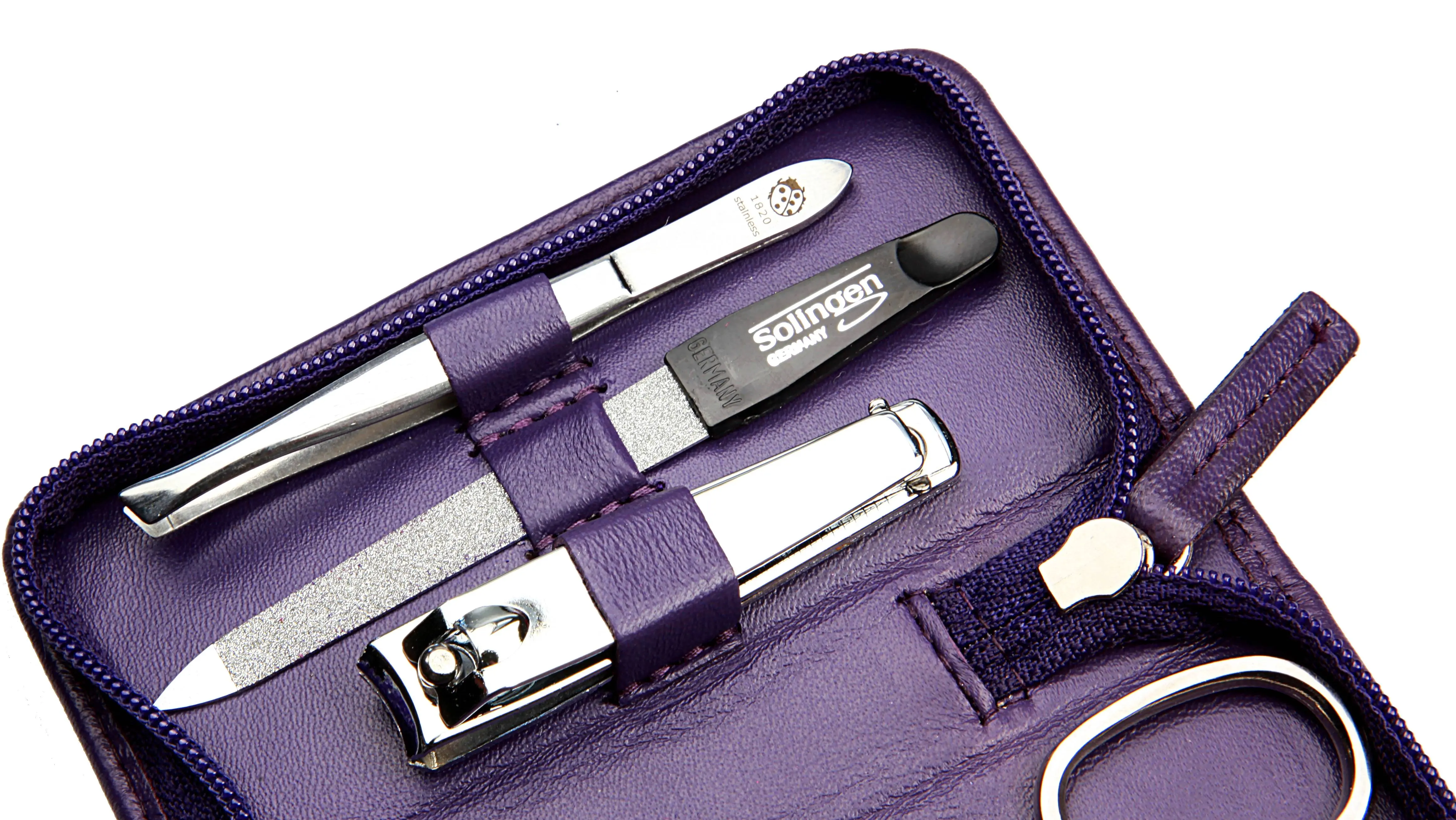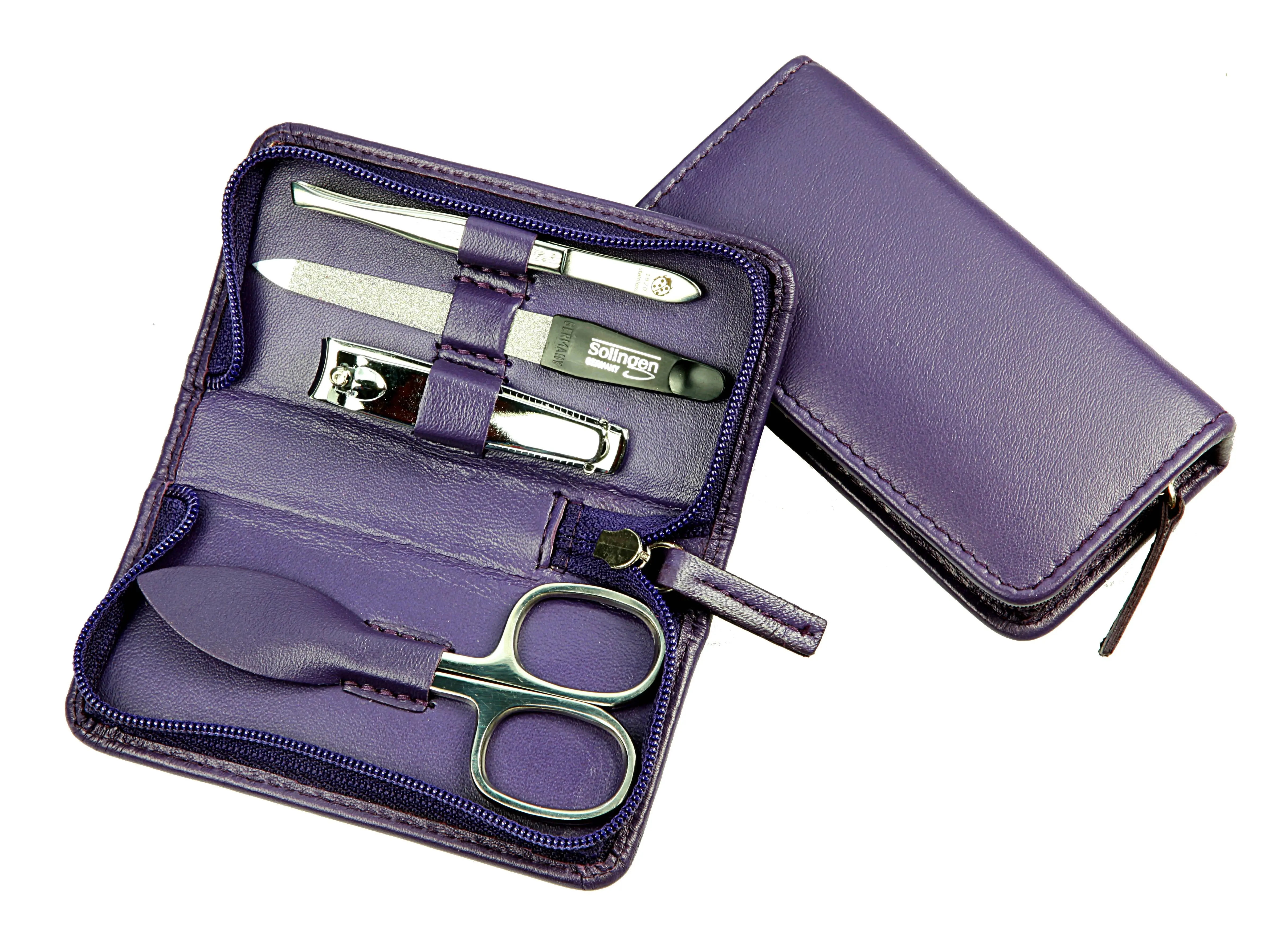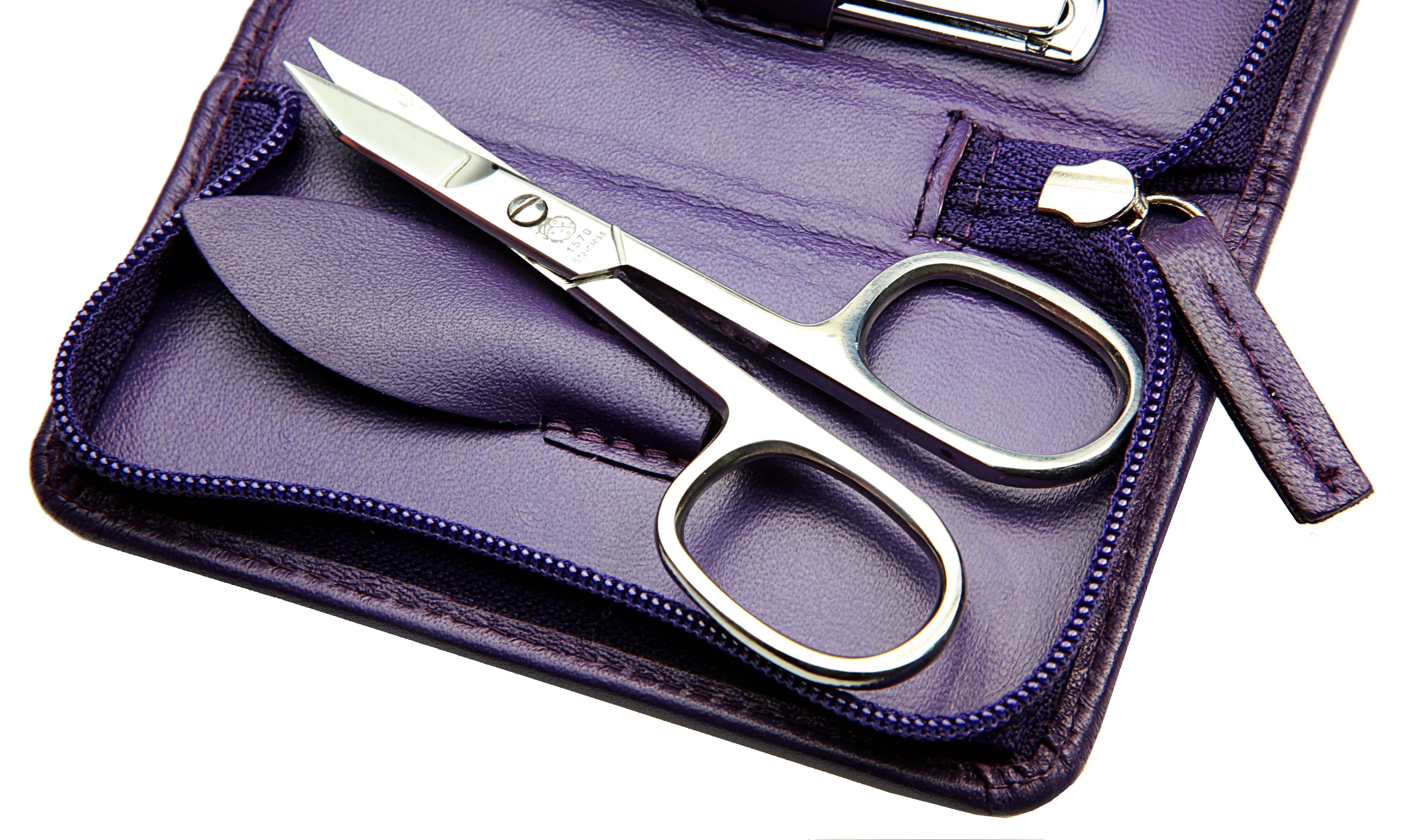 zippered manicure set: 4 implements, stainless steel, mirror-polished; nappa lambskin, lilac