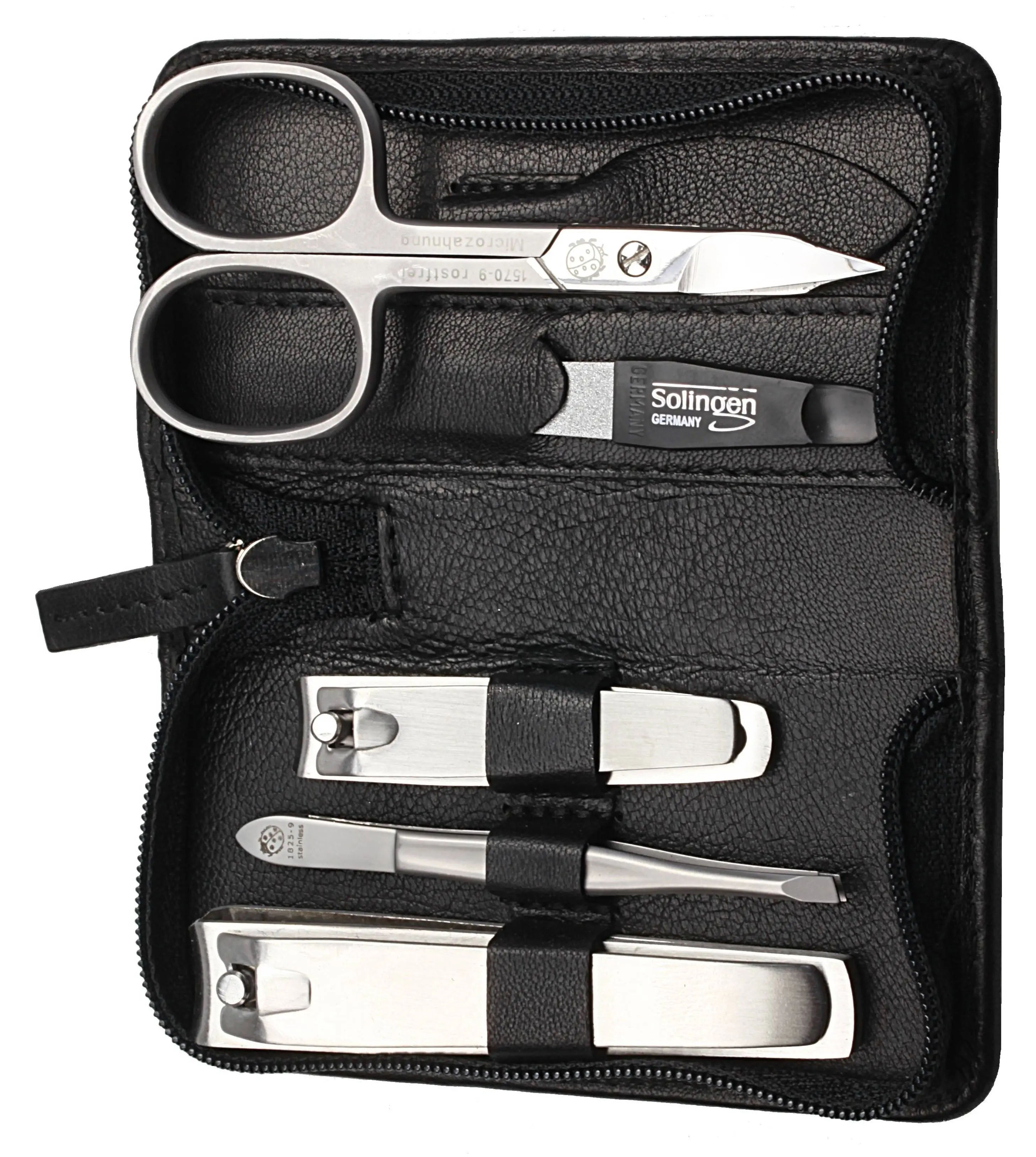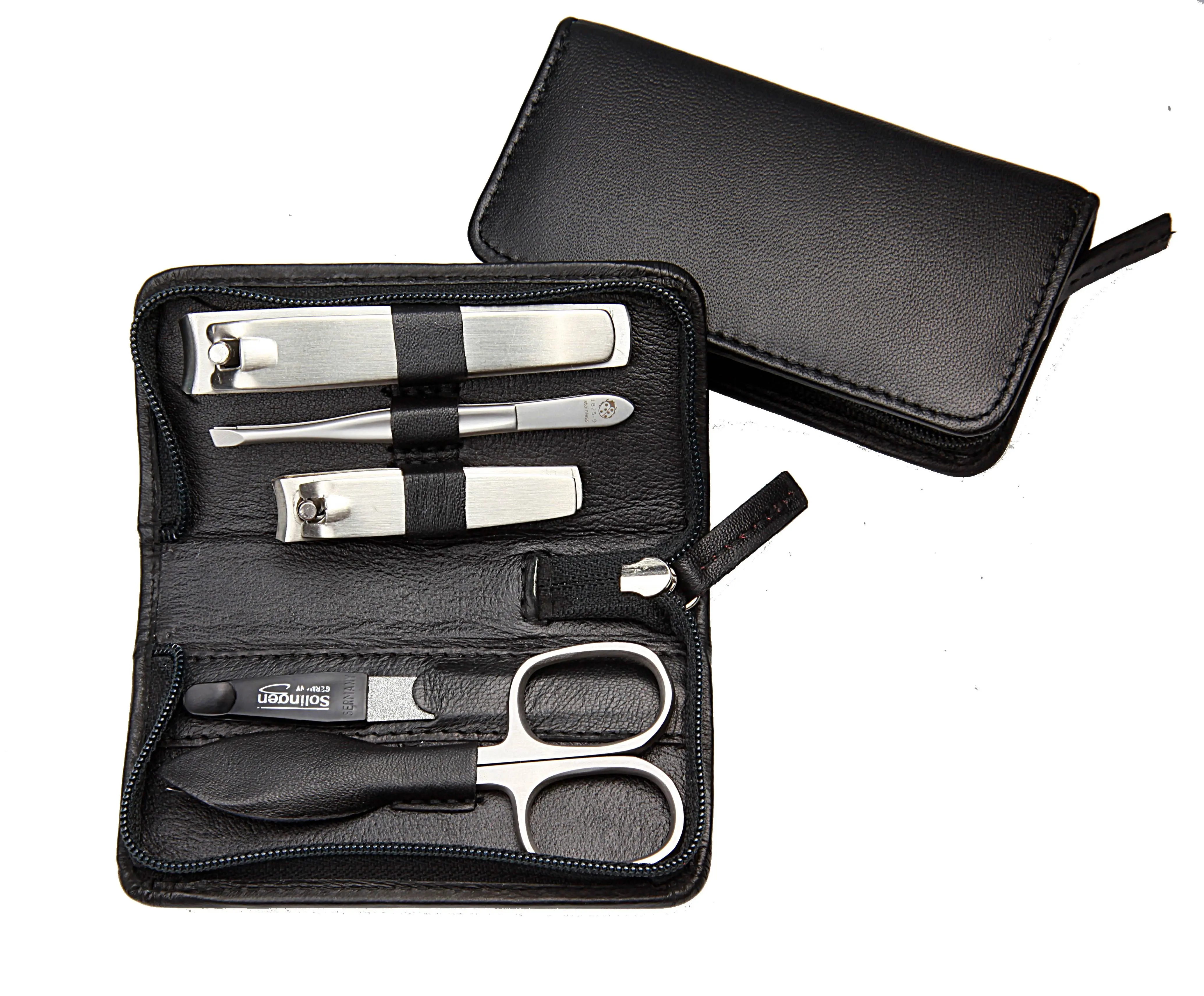 zippered manicure set: 5 implements, stainless steel, matt finish; nappa sheepskin, black