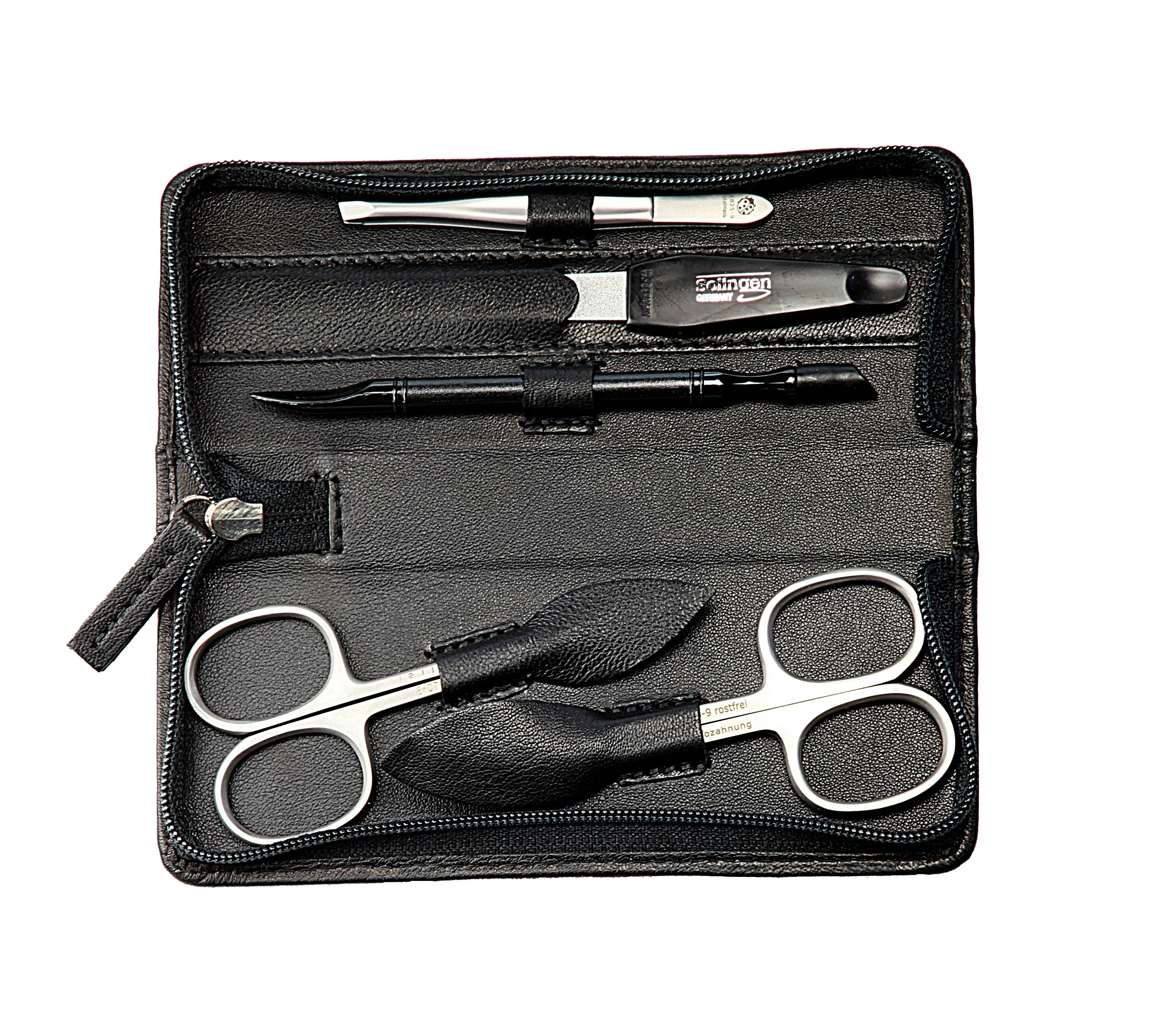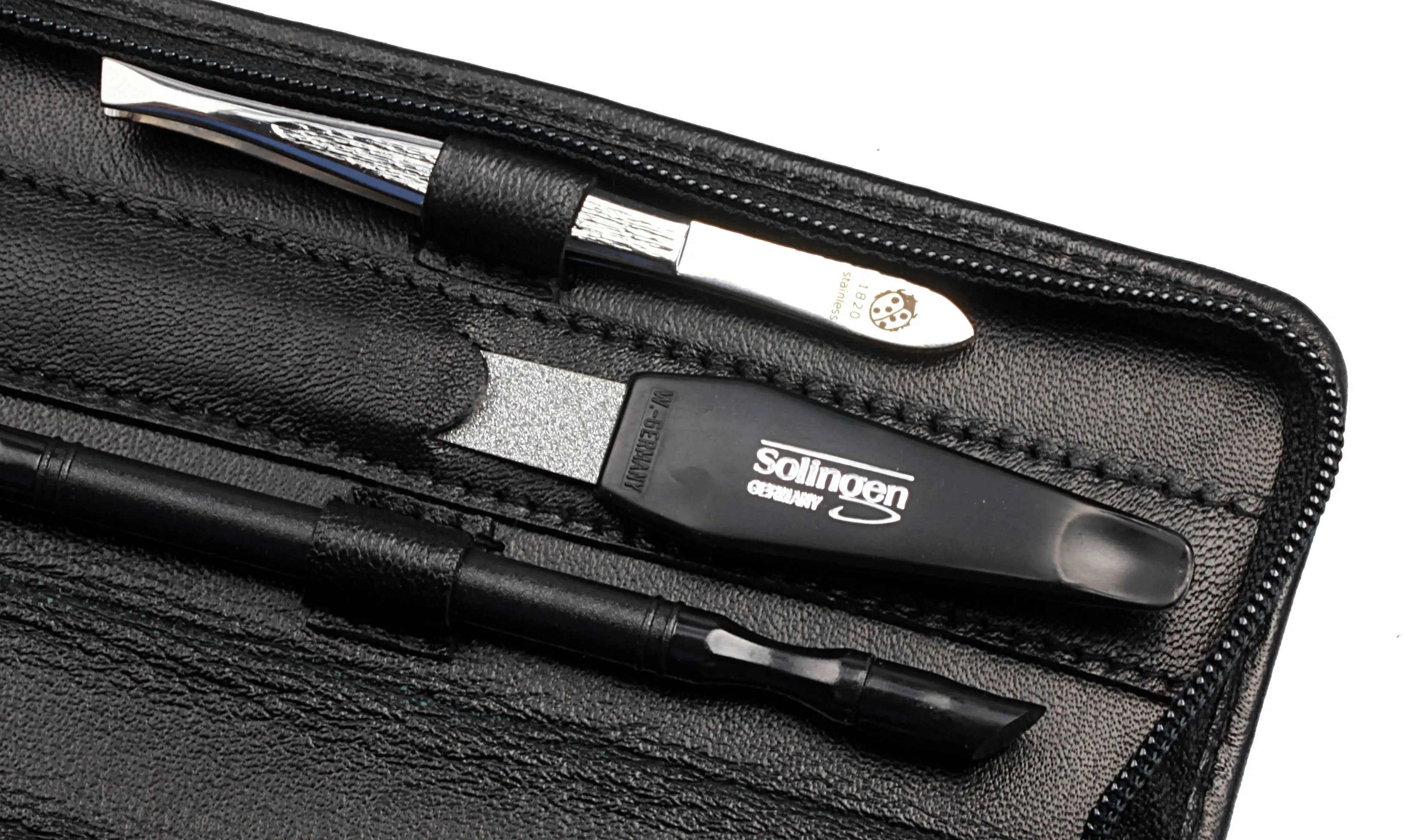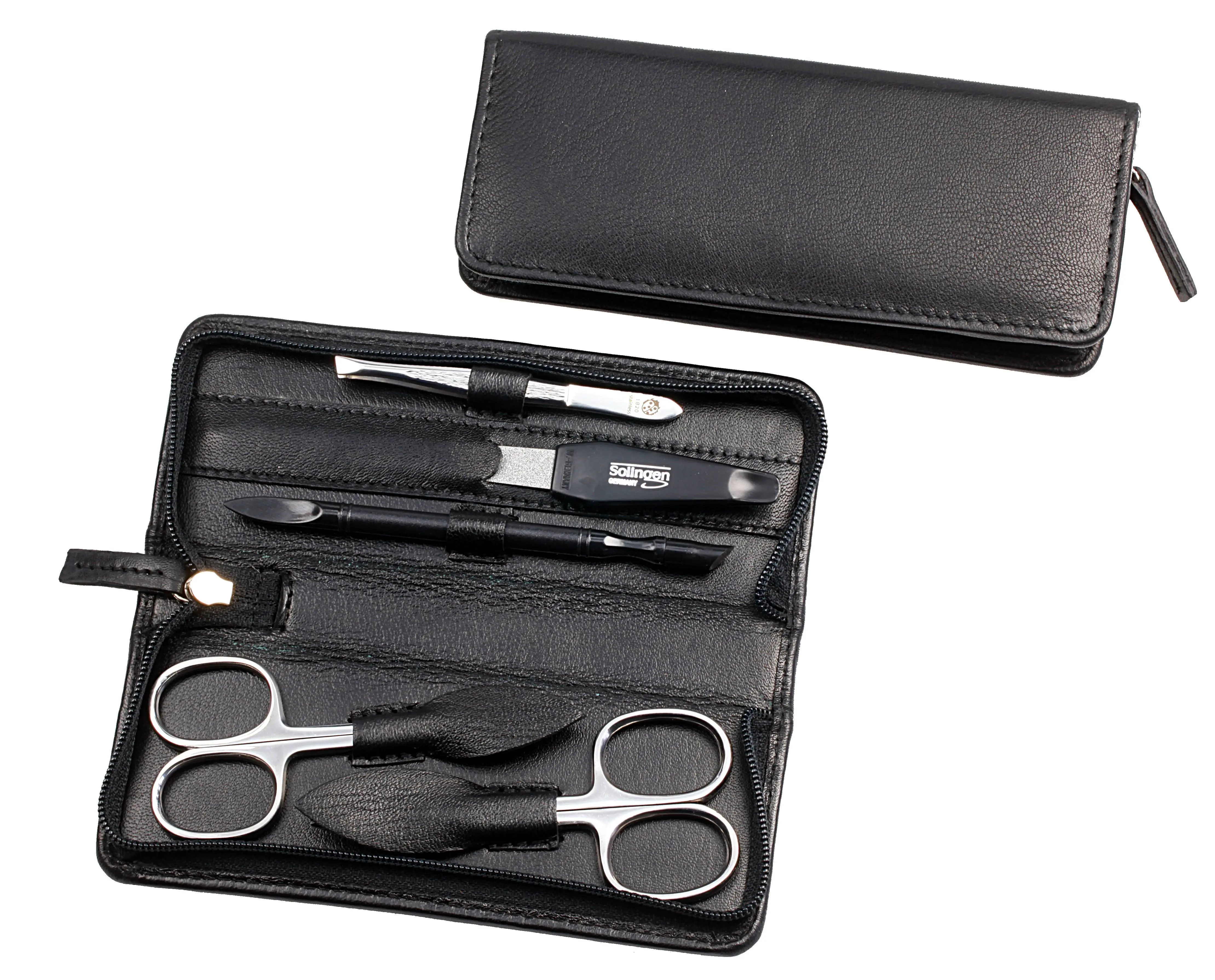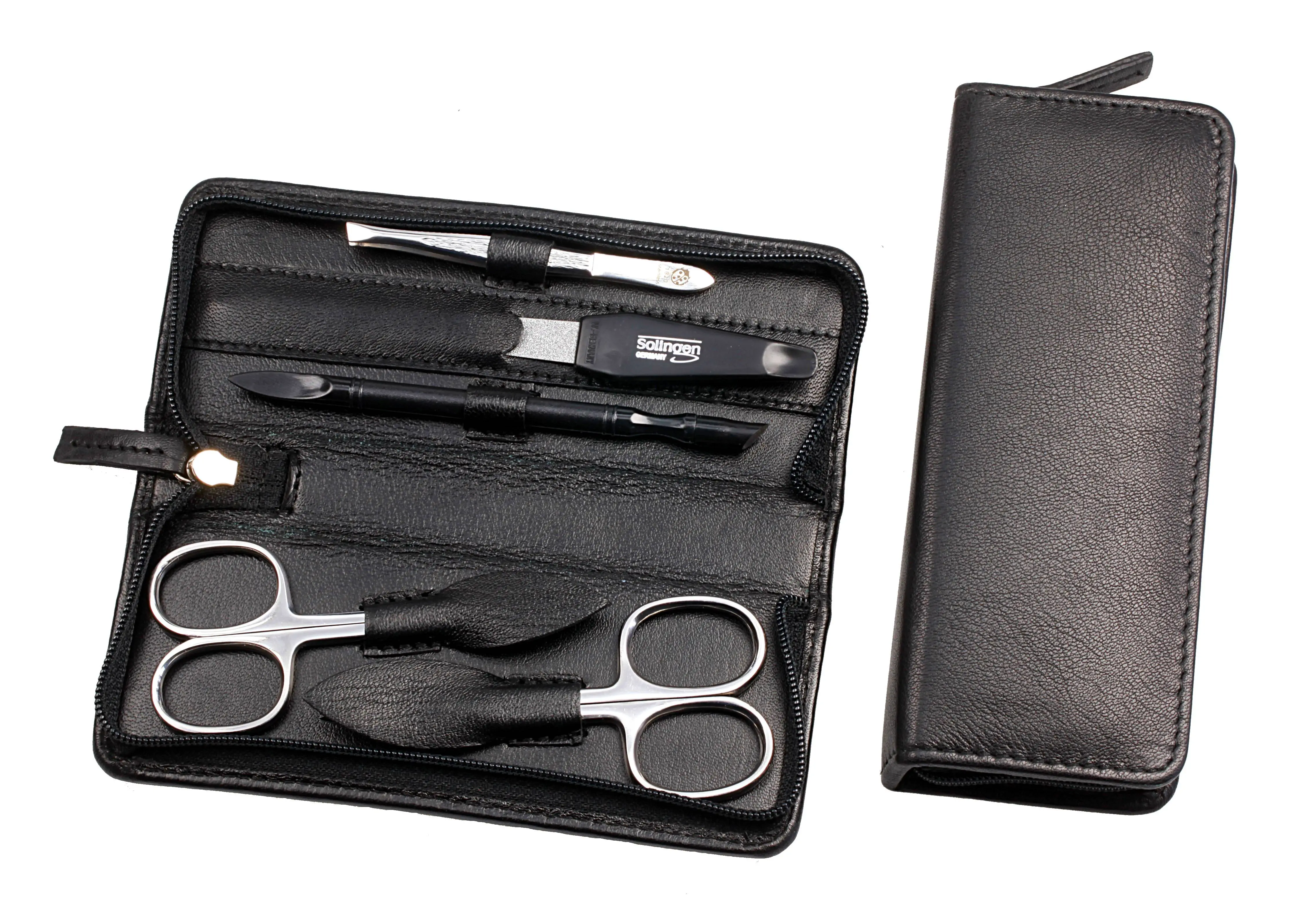 zippered manicure-set: 5 implements, stainless steel, miror polished; nappa lambskin, black
