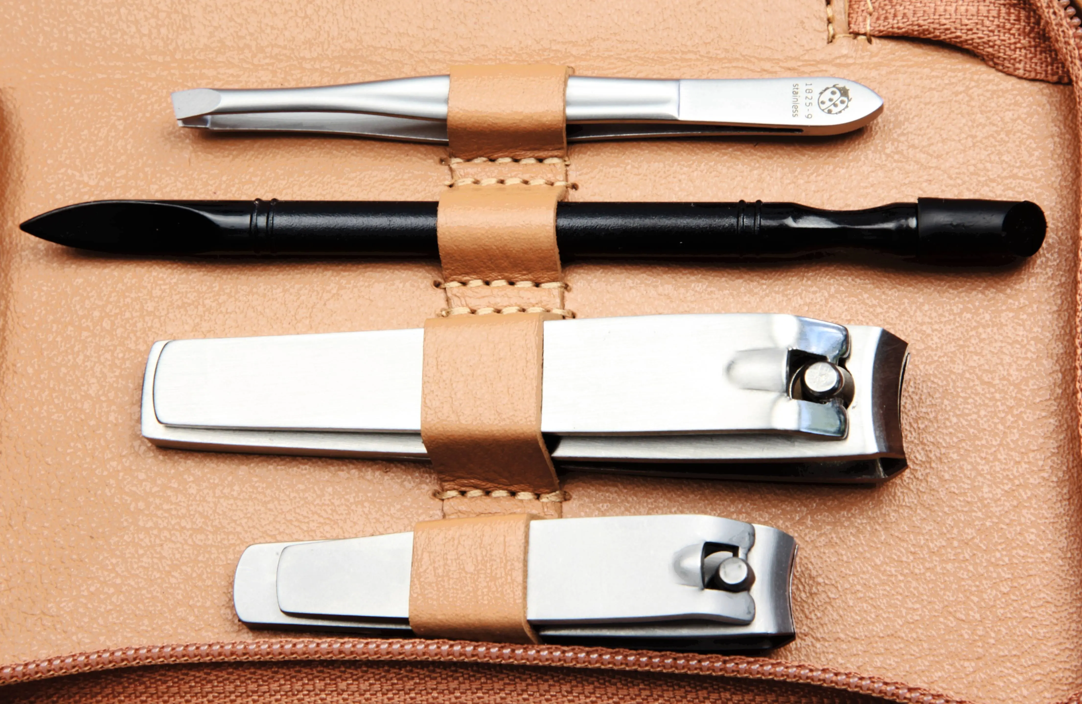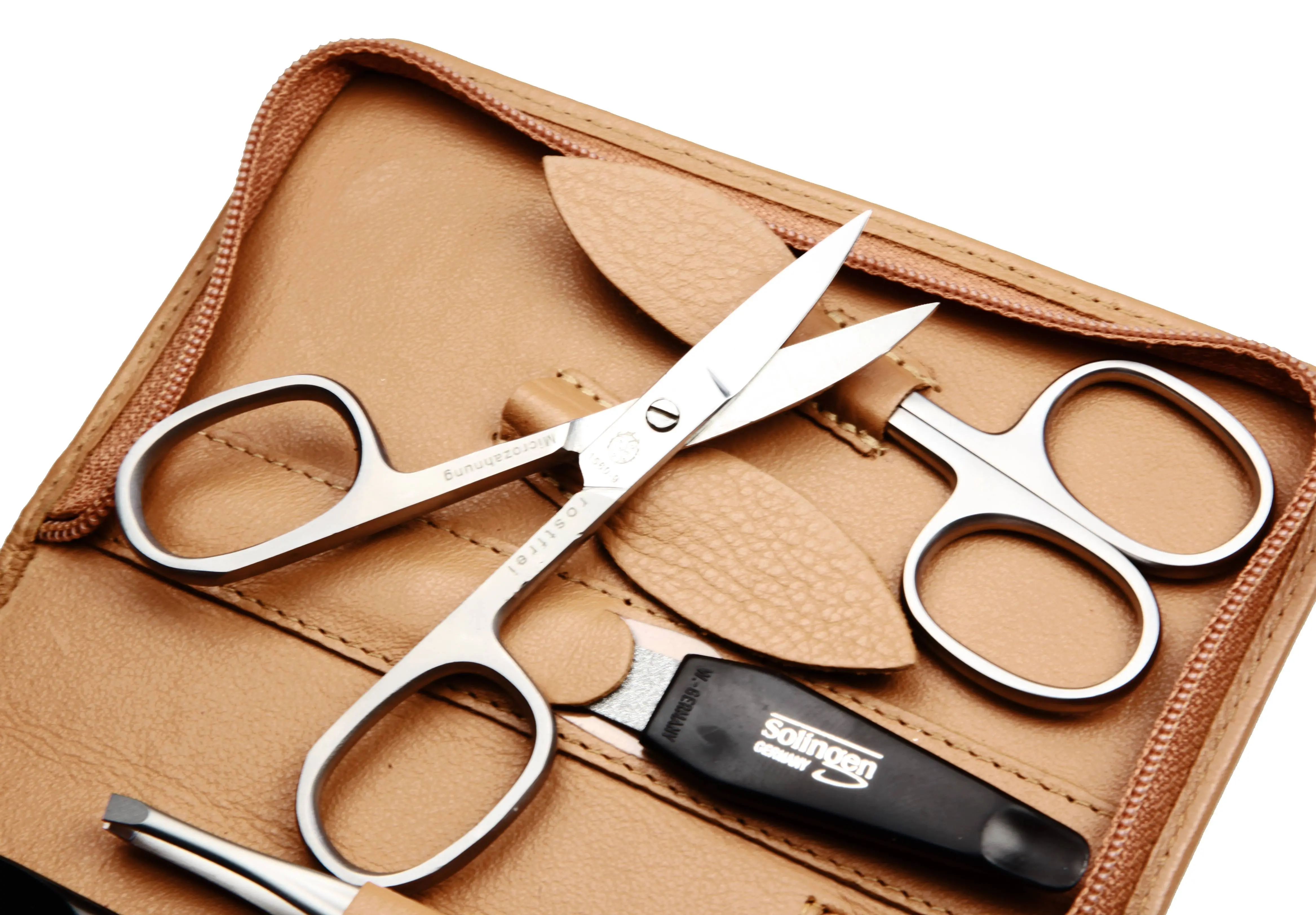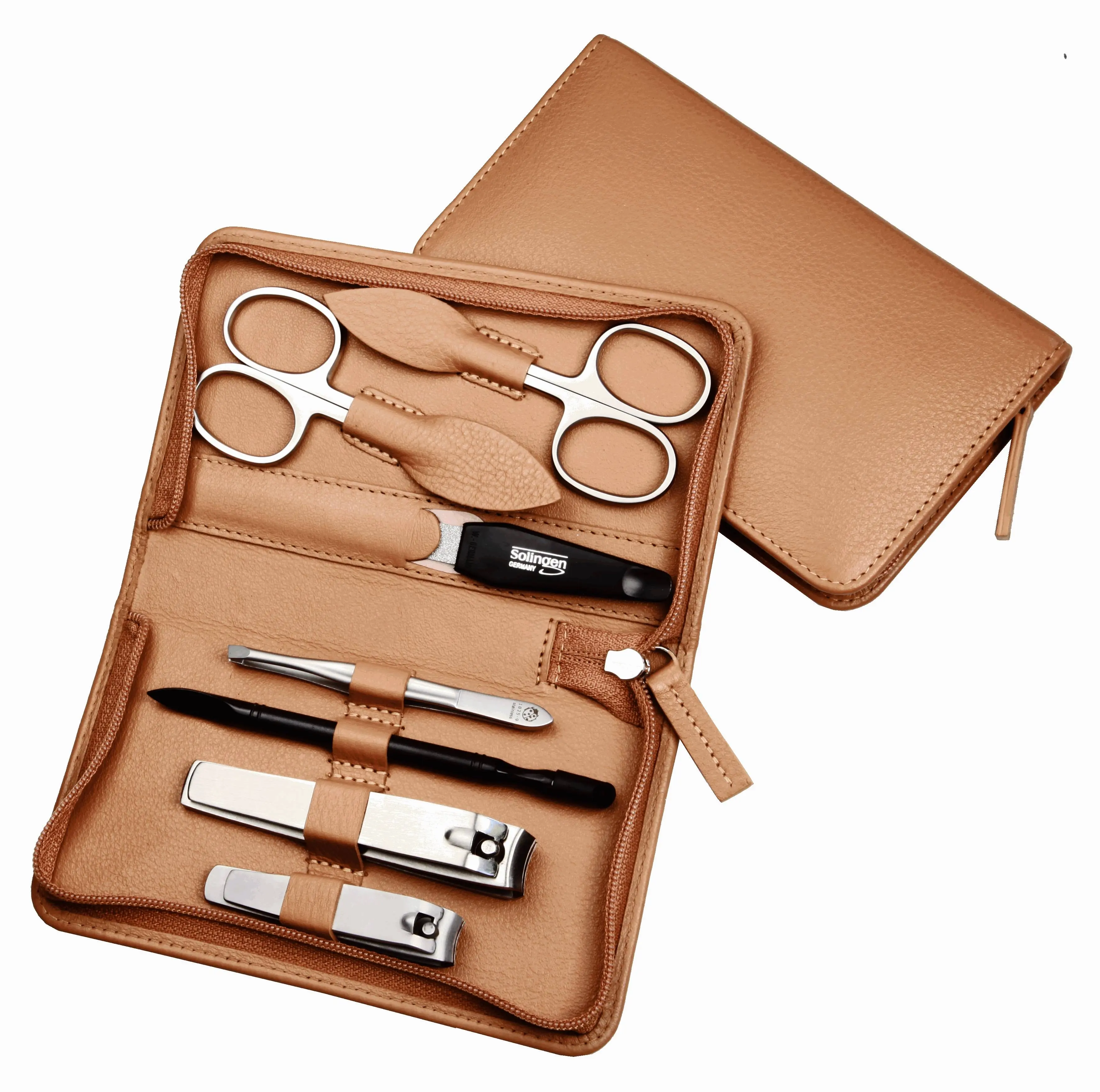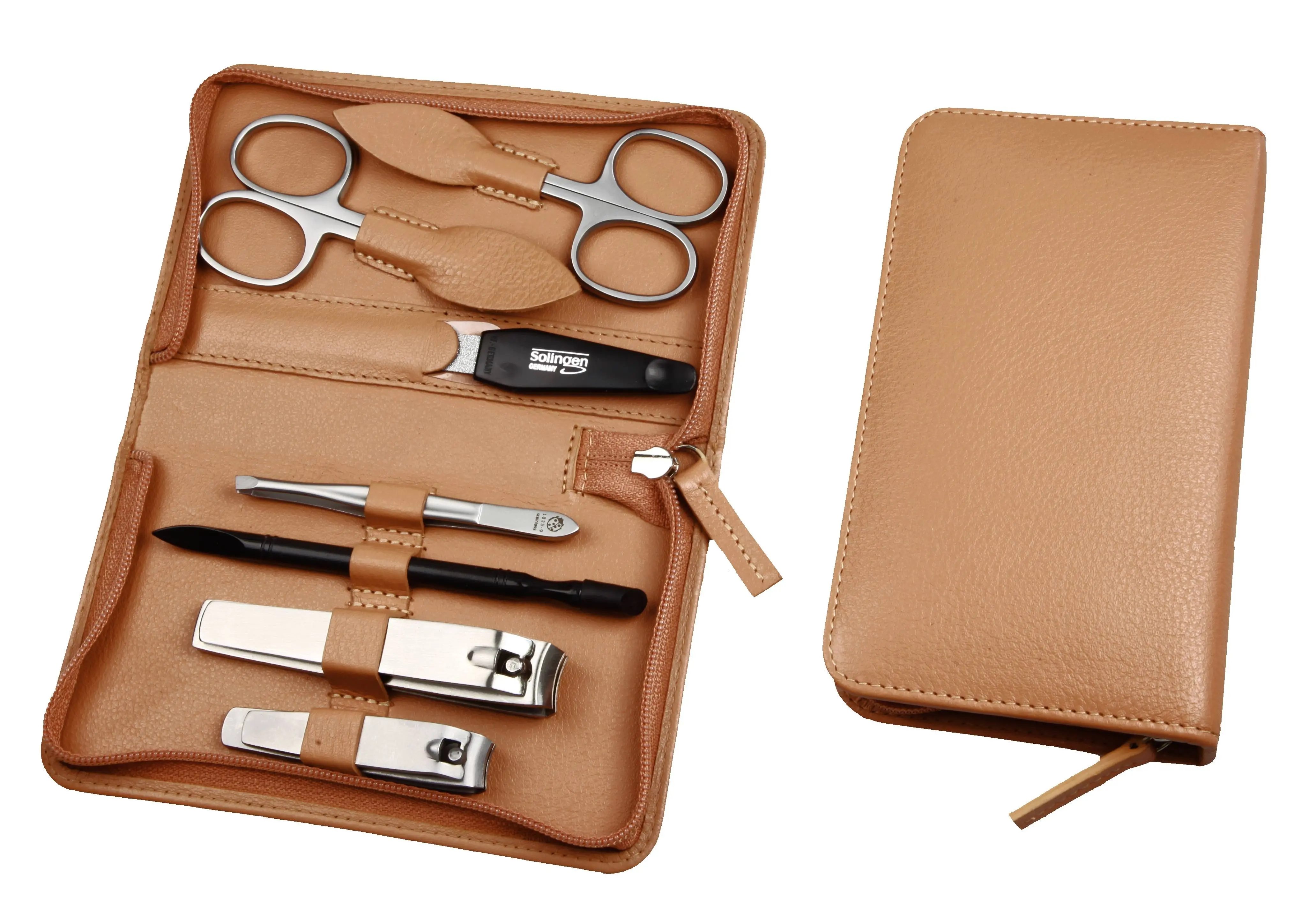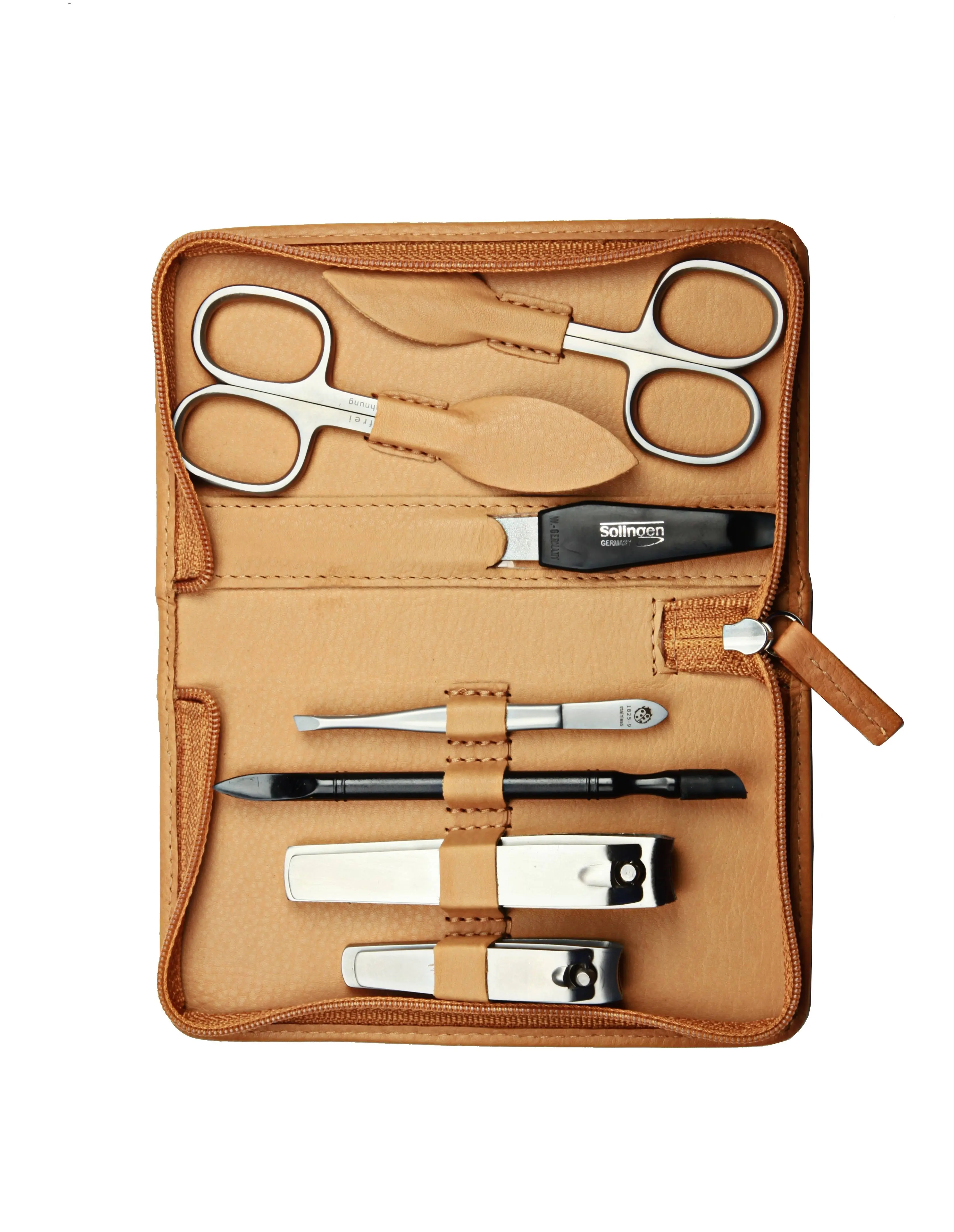zippered manicure set: 7 implements, stainless steel, matt finish; fullgrain cowhide, sand