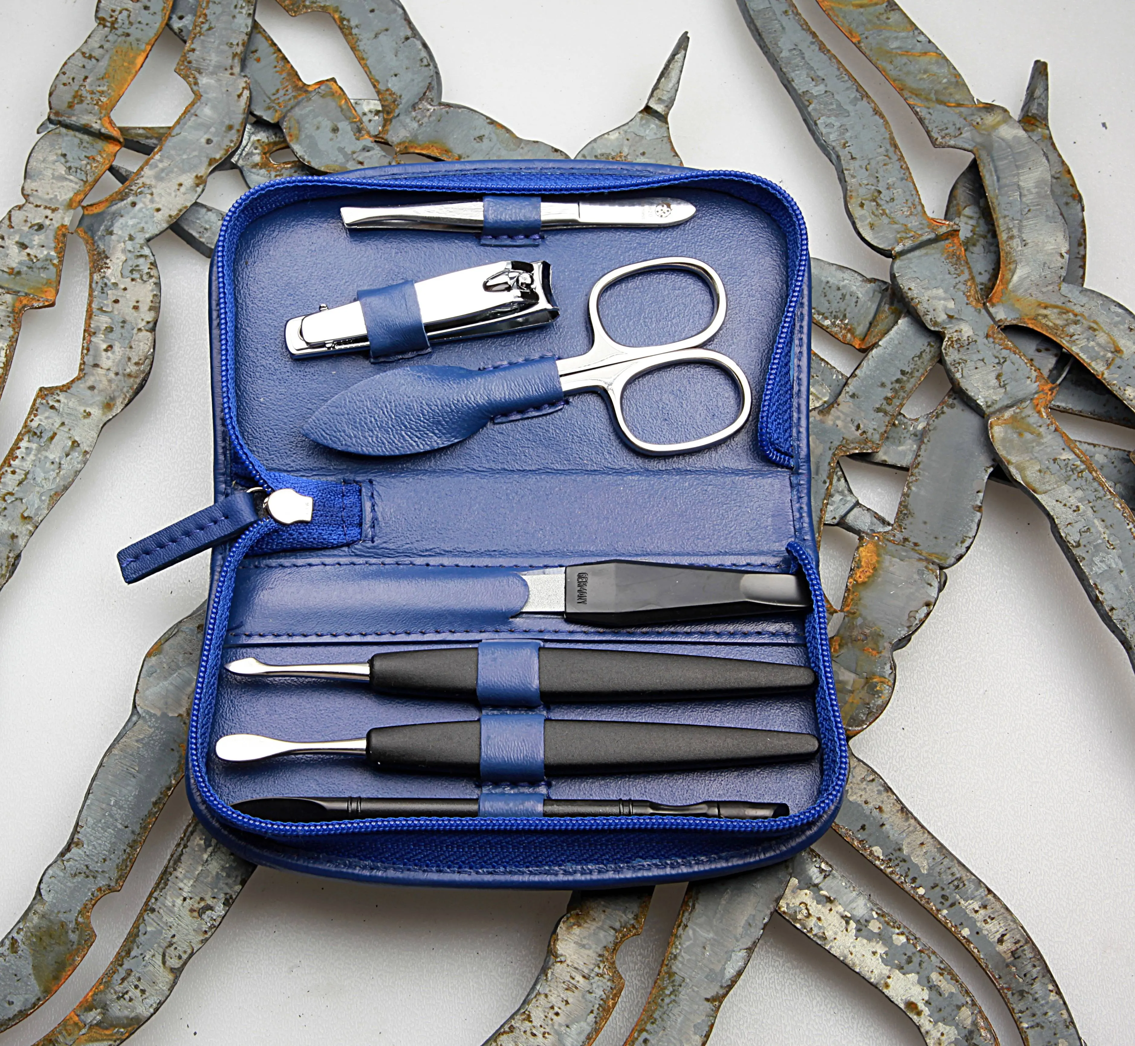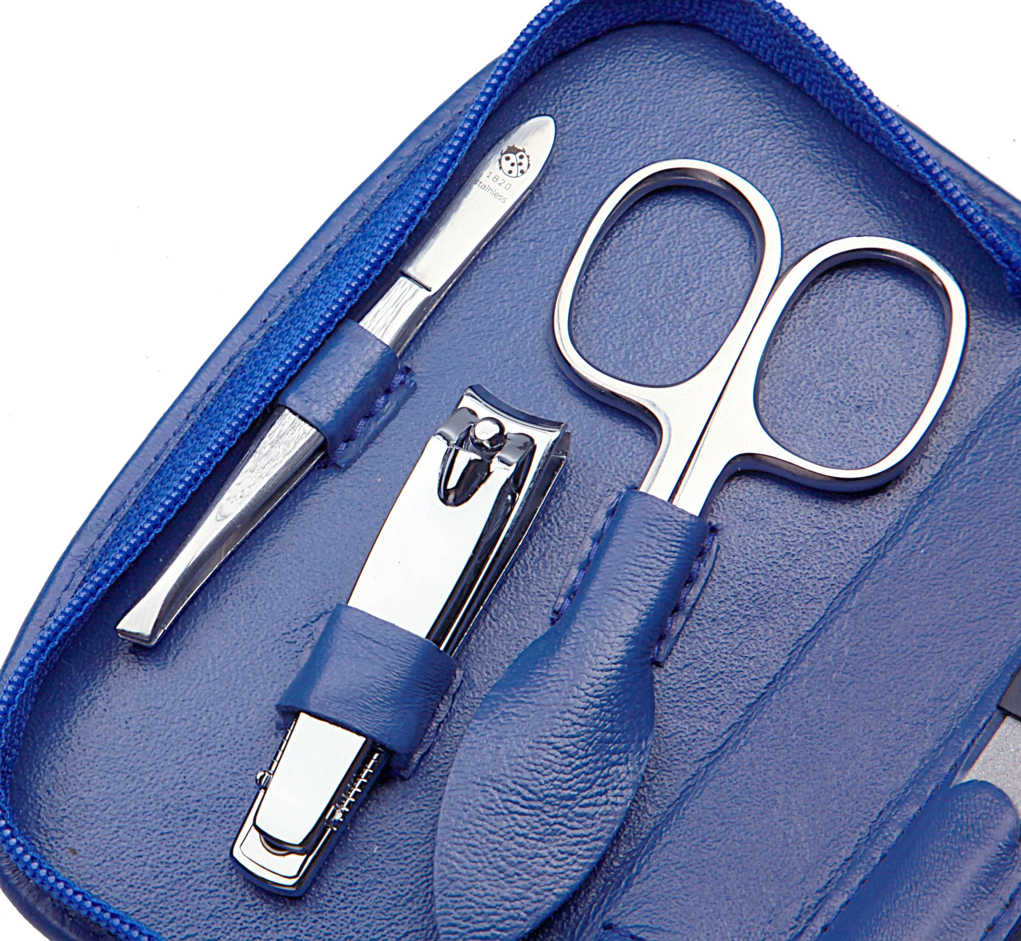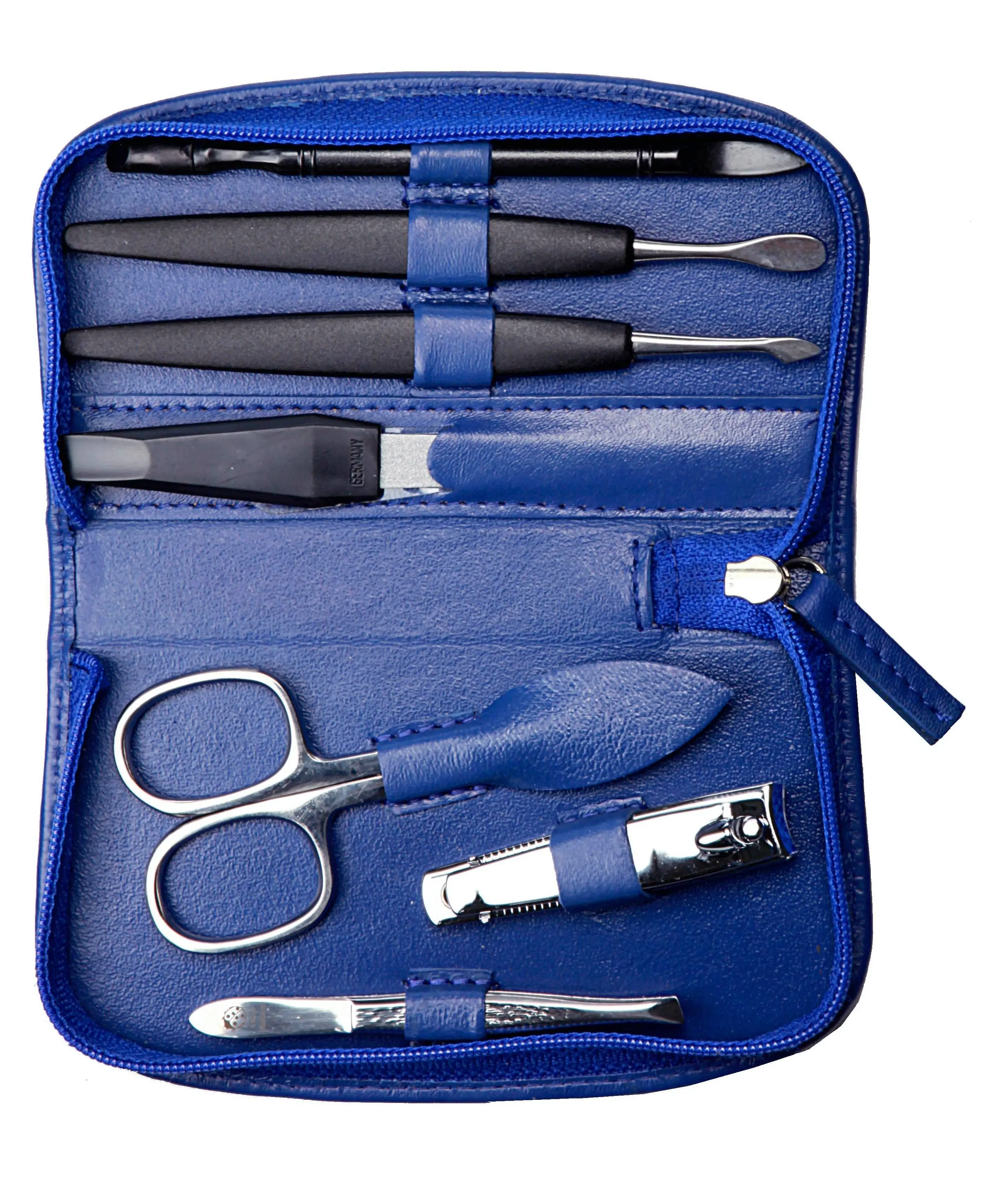 zippered manicure set: 7 implements, stainless steel, mirror polished; nappa lambskin, cobalt blue