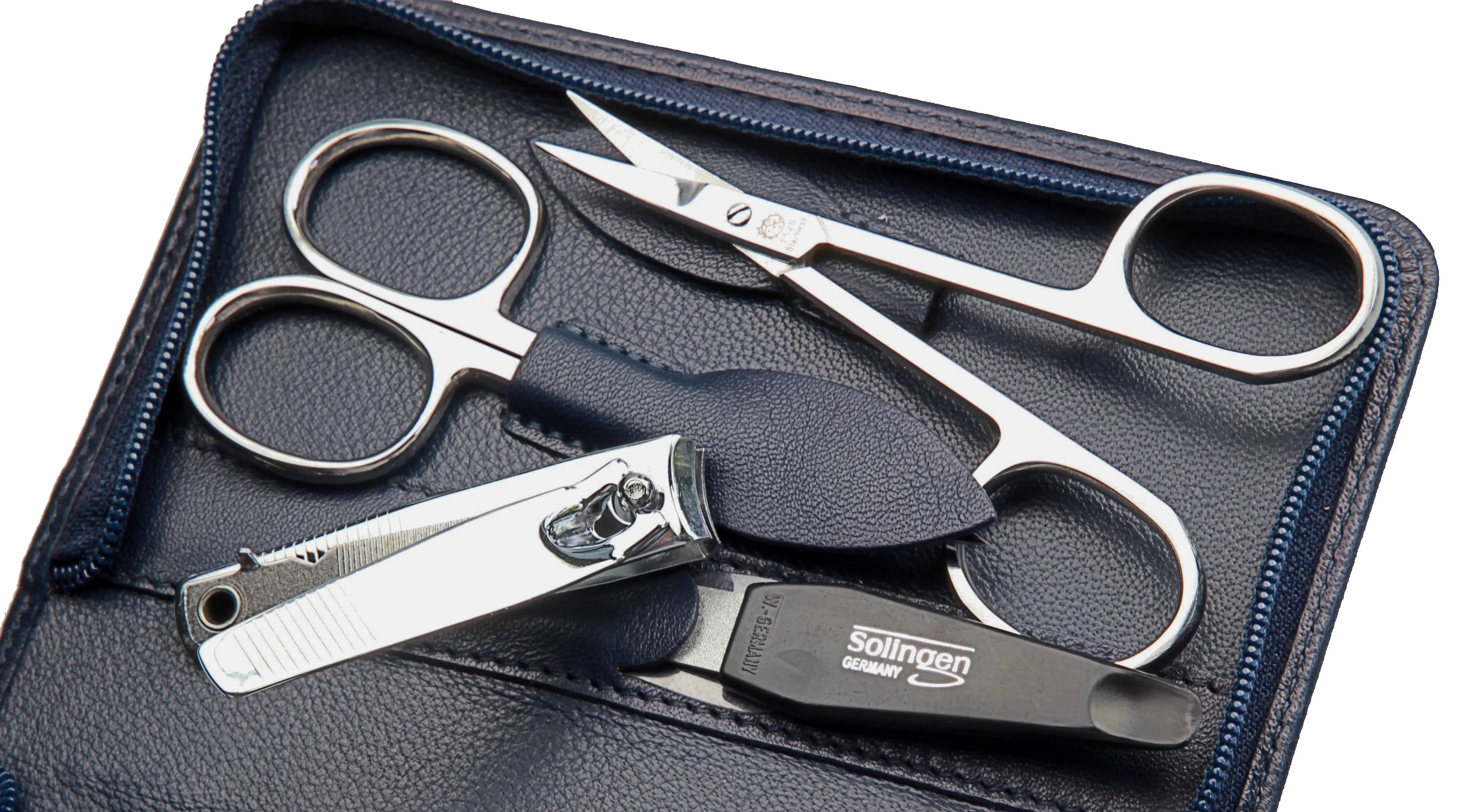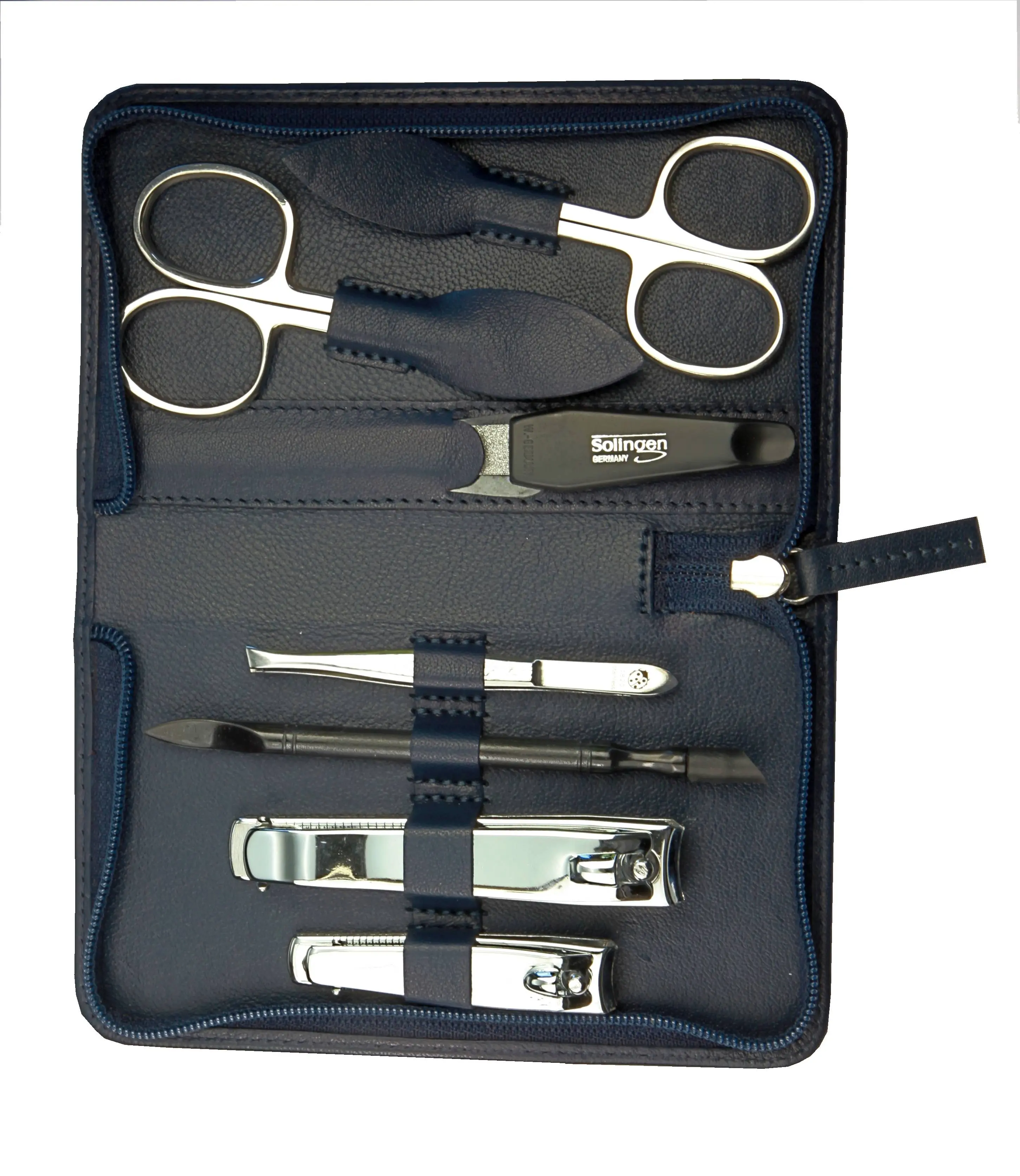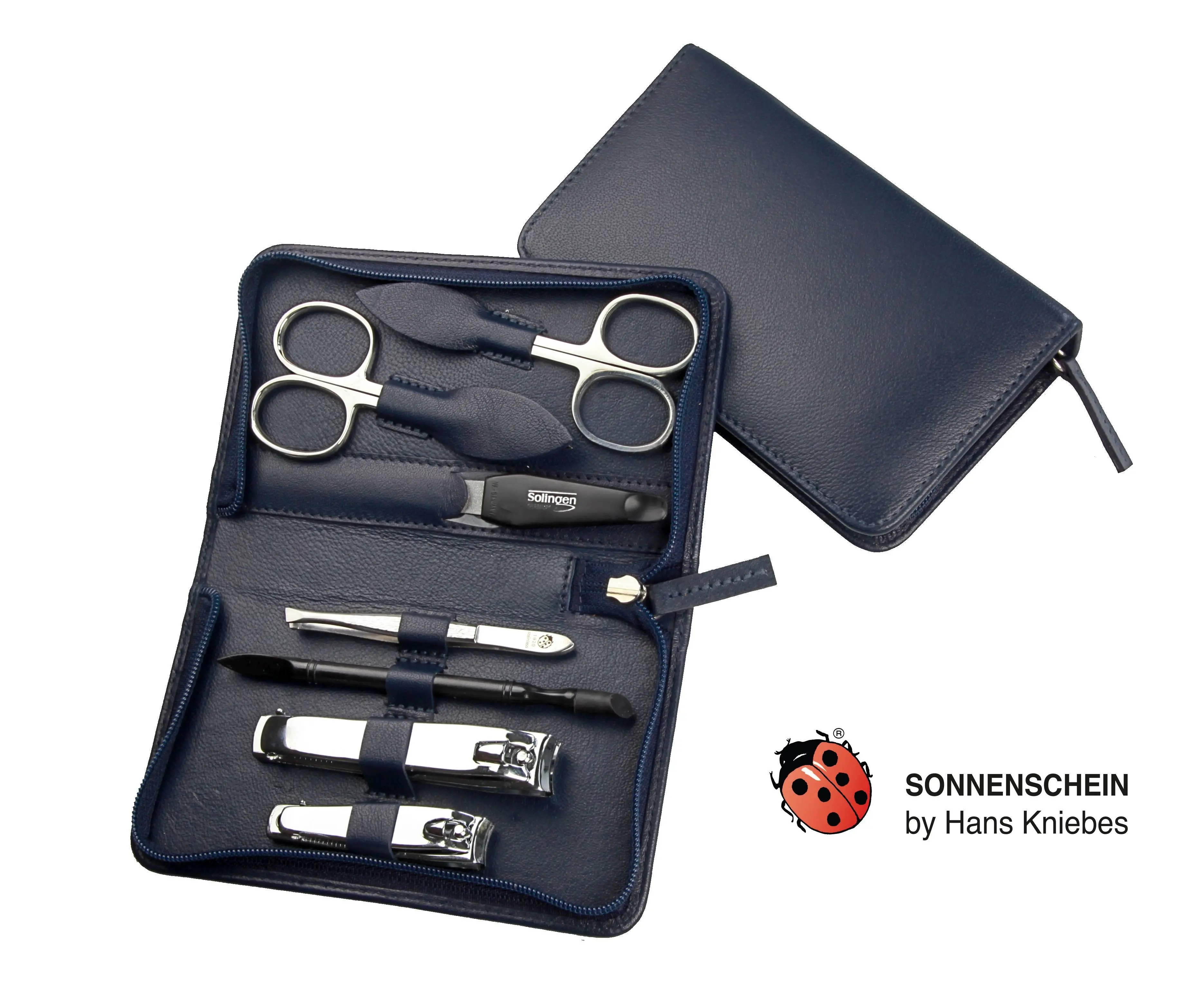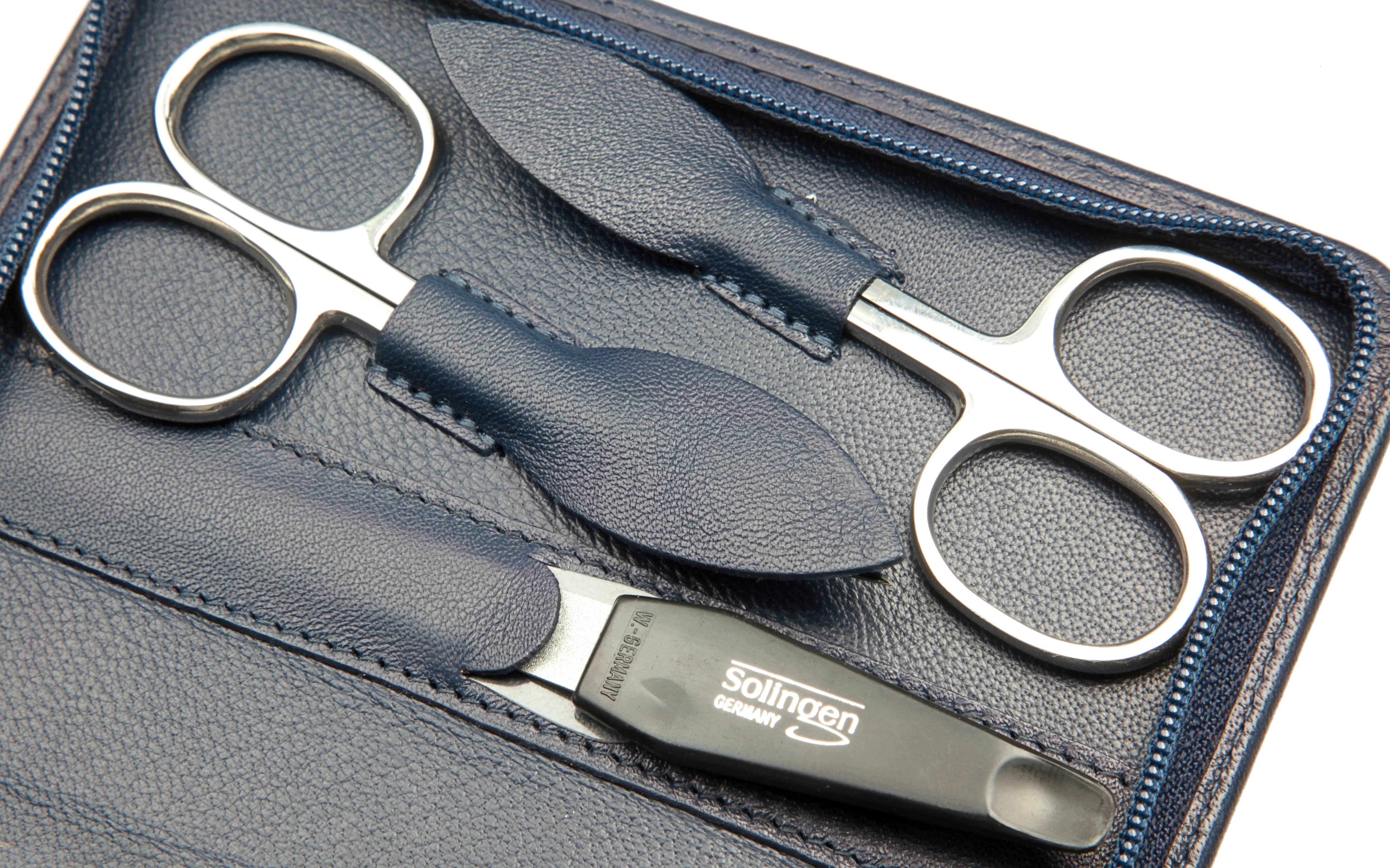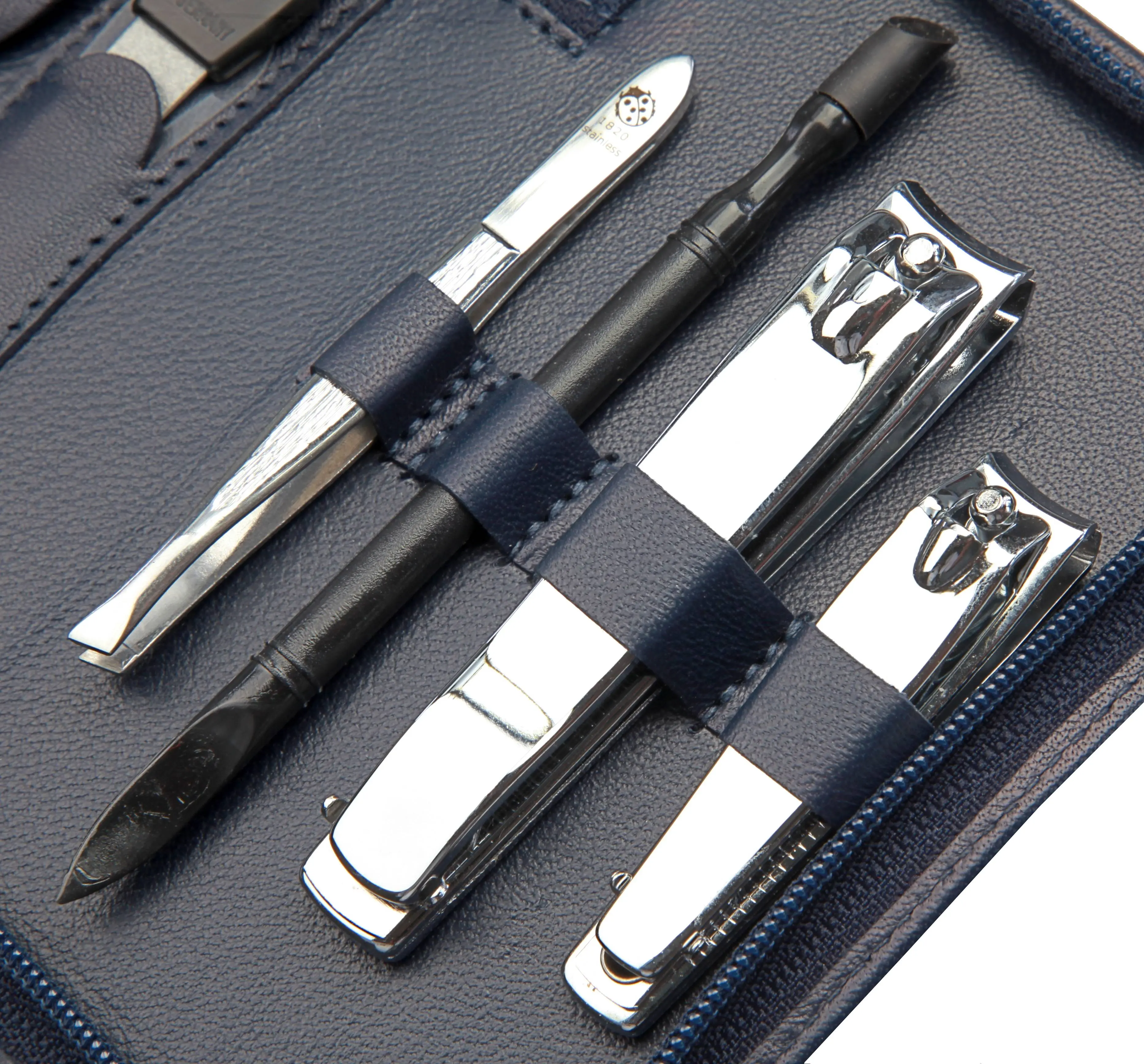 zippered manicure set: 7 implements, stainless steel, mirror-polished; nappa lambskin, navy blue