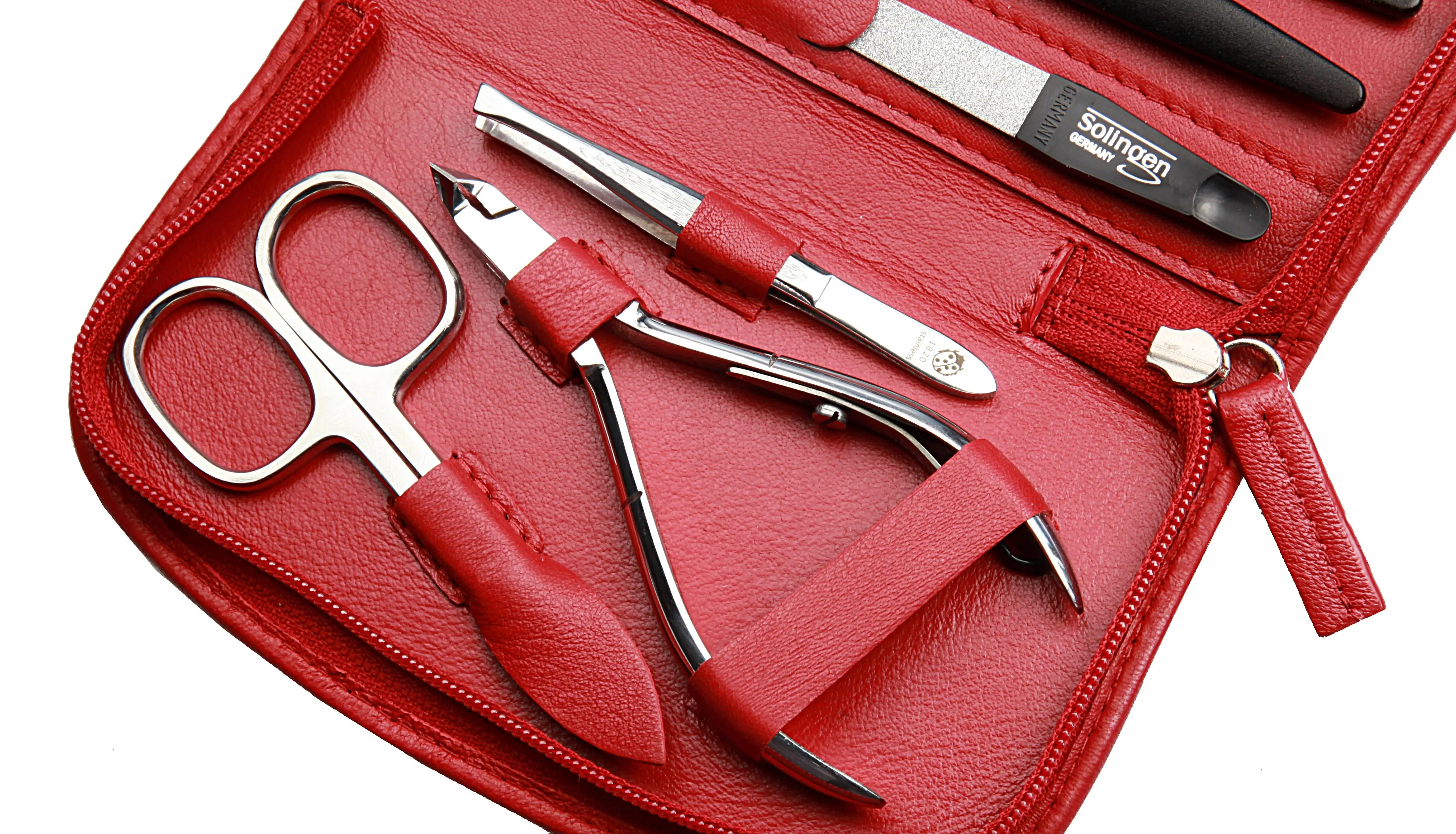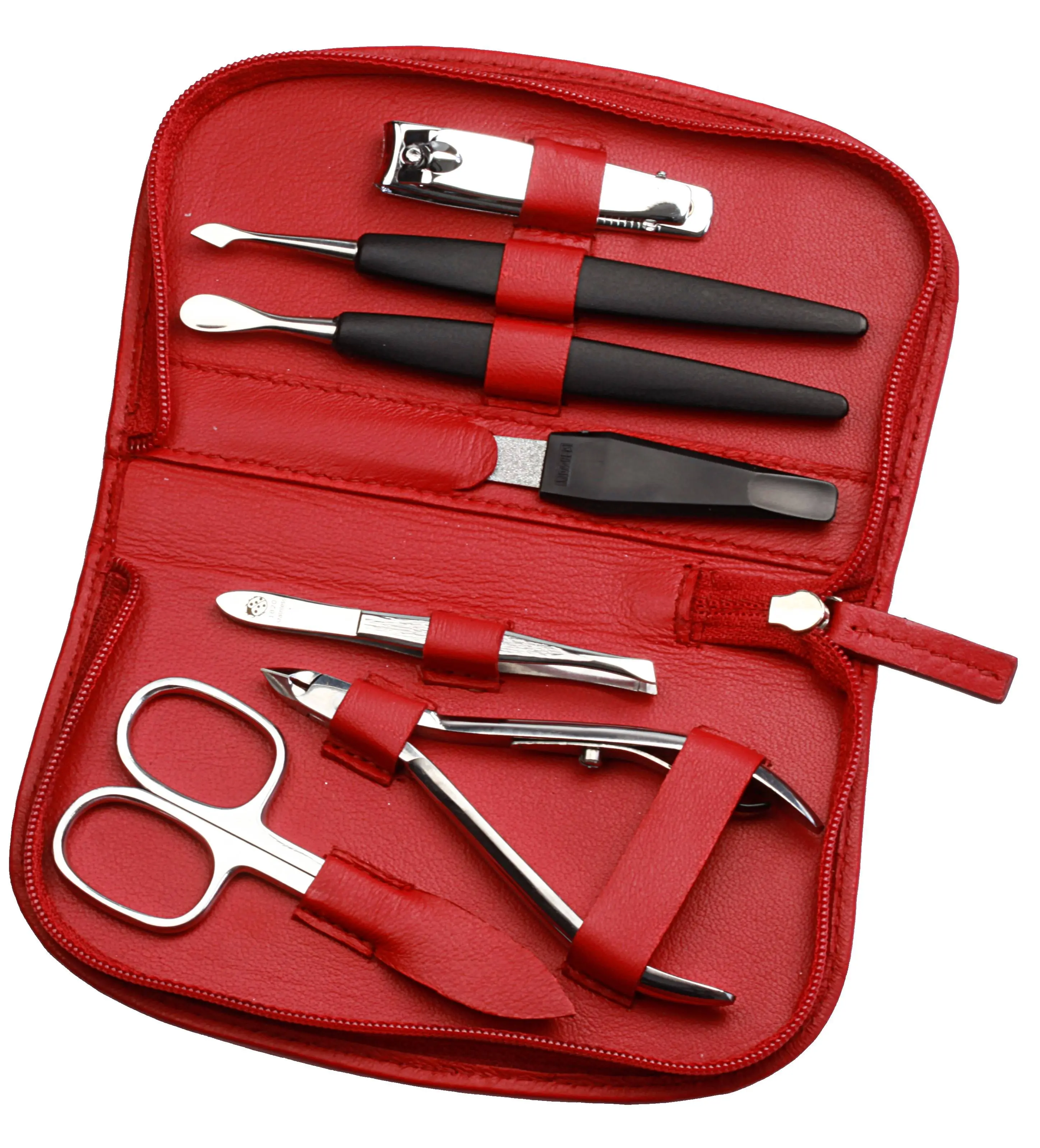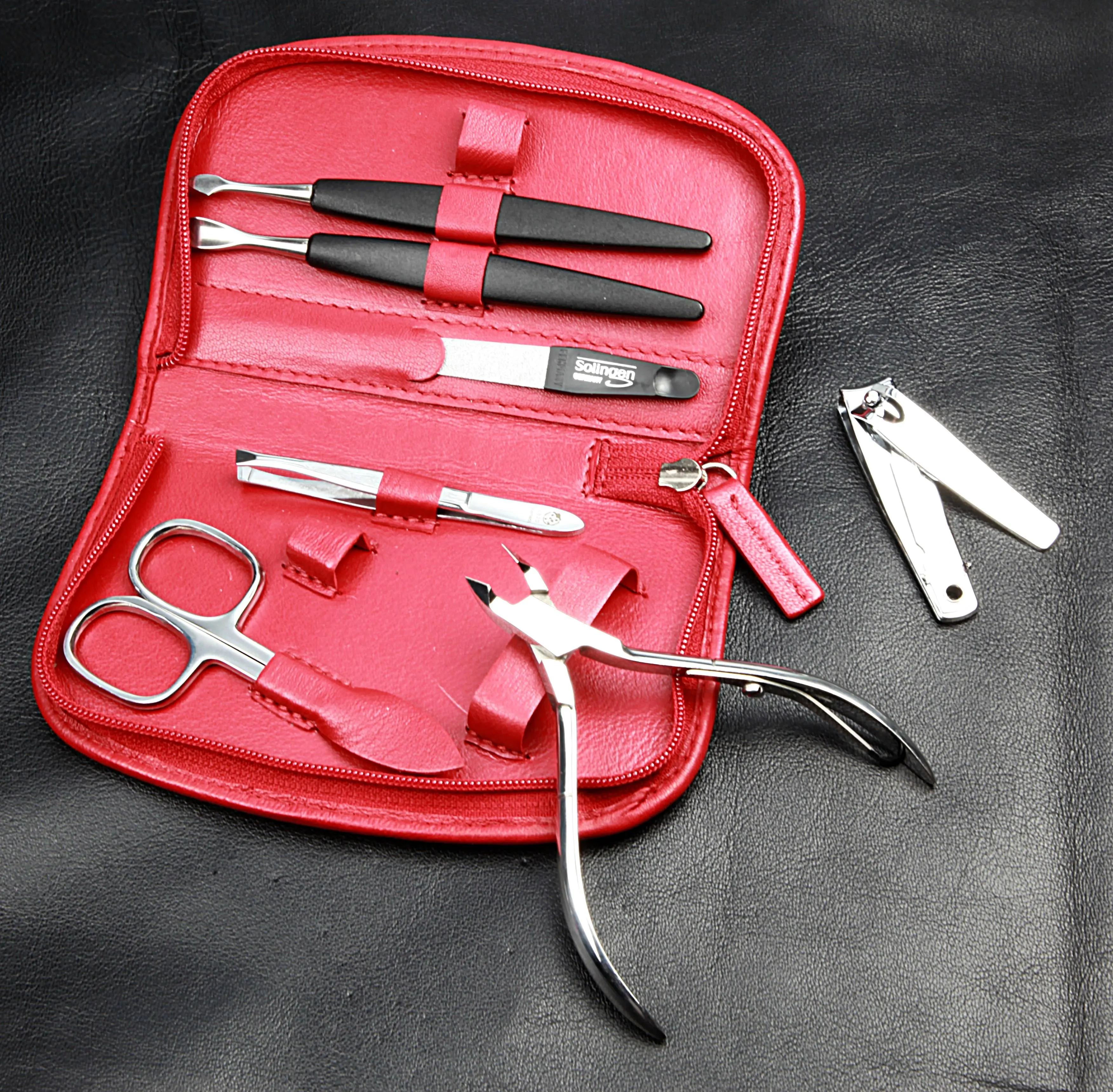zippered manicure set: 7 implements, stainless steel, mirror polished; nappa lambskin, red