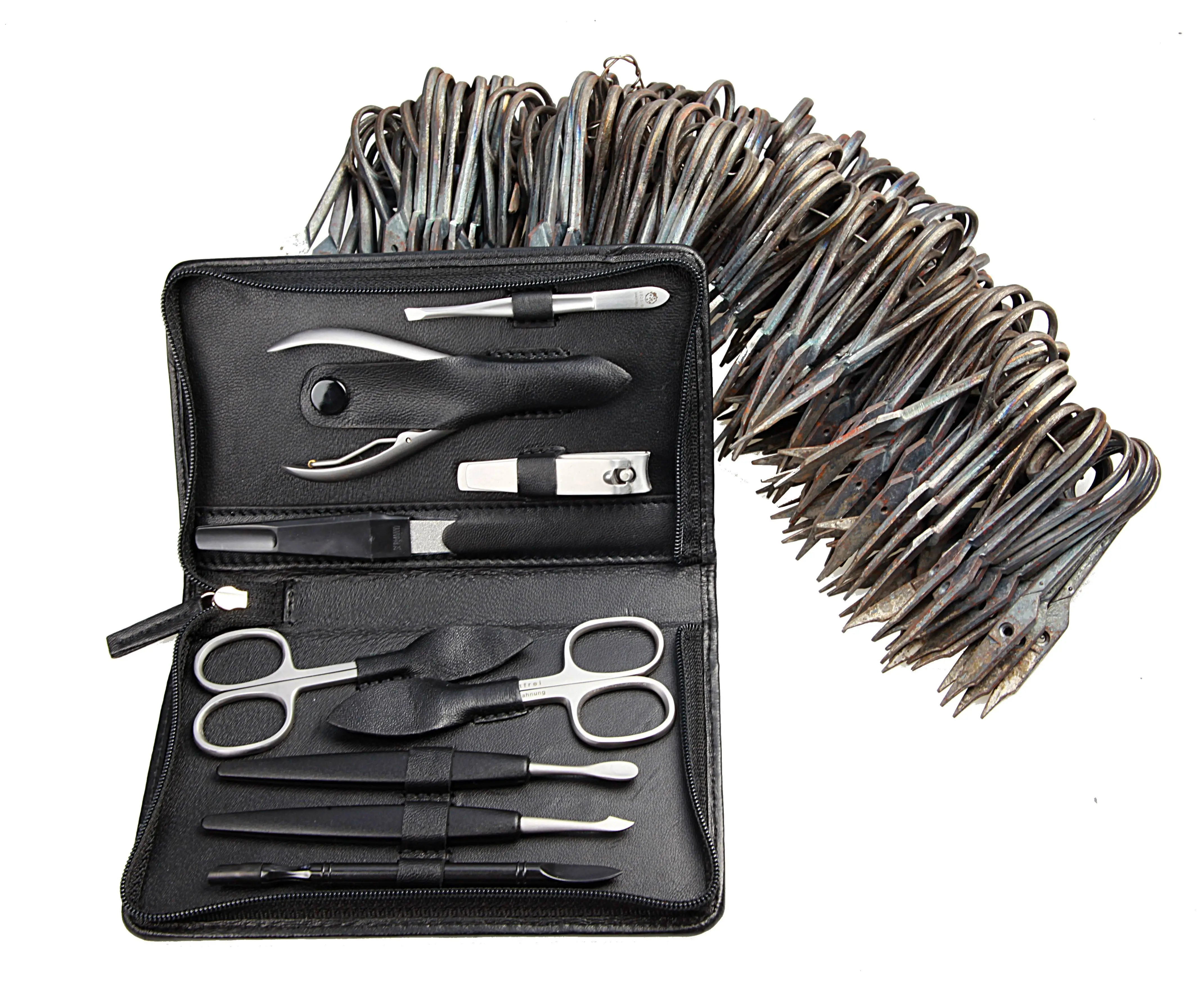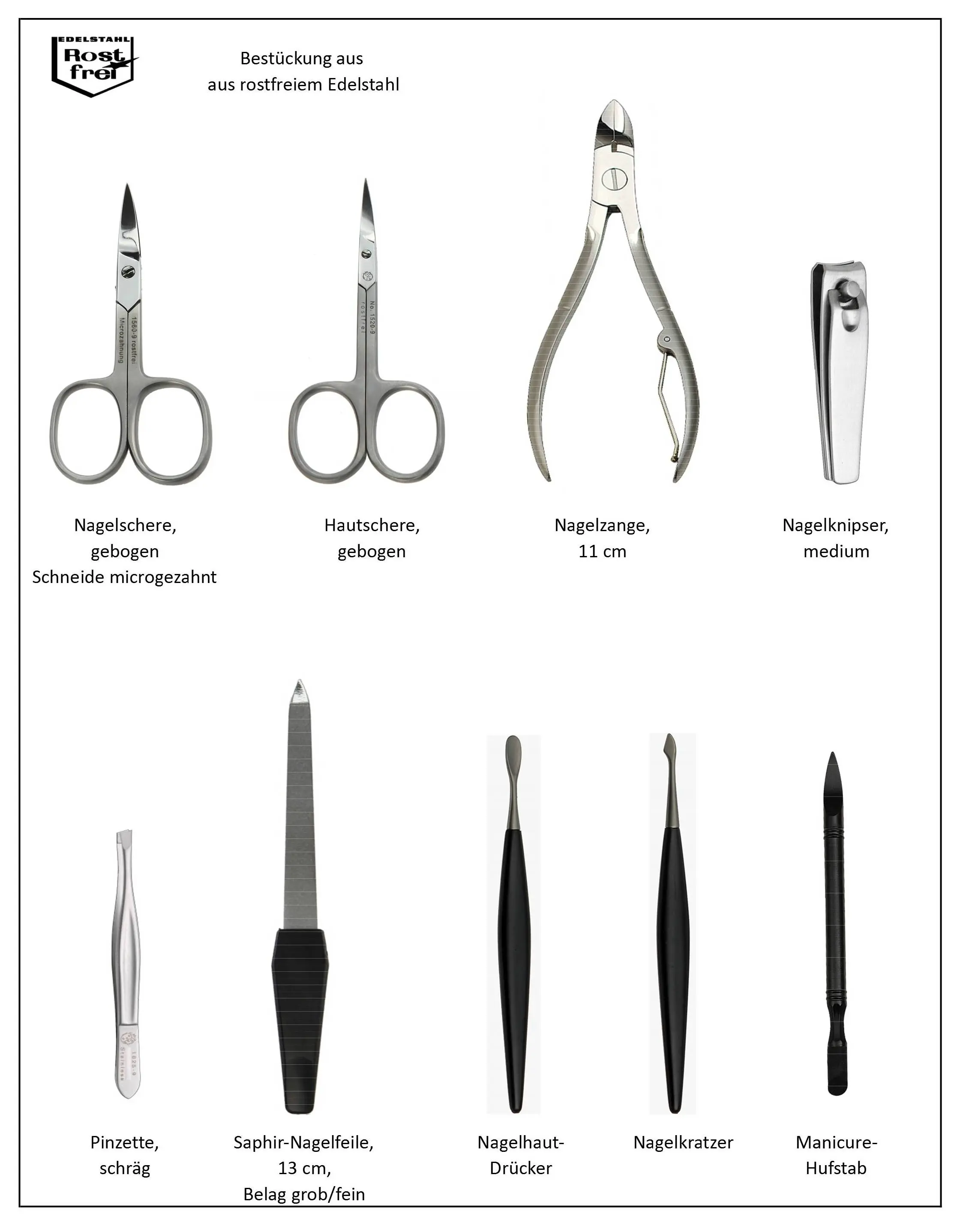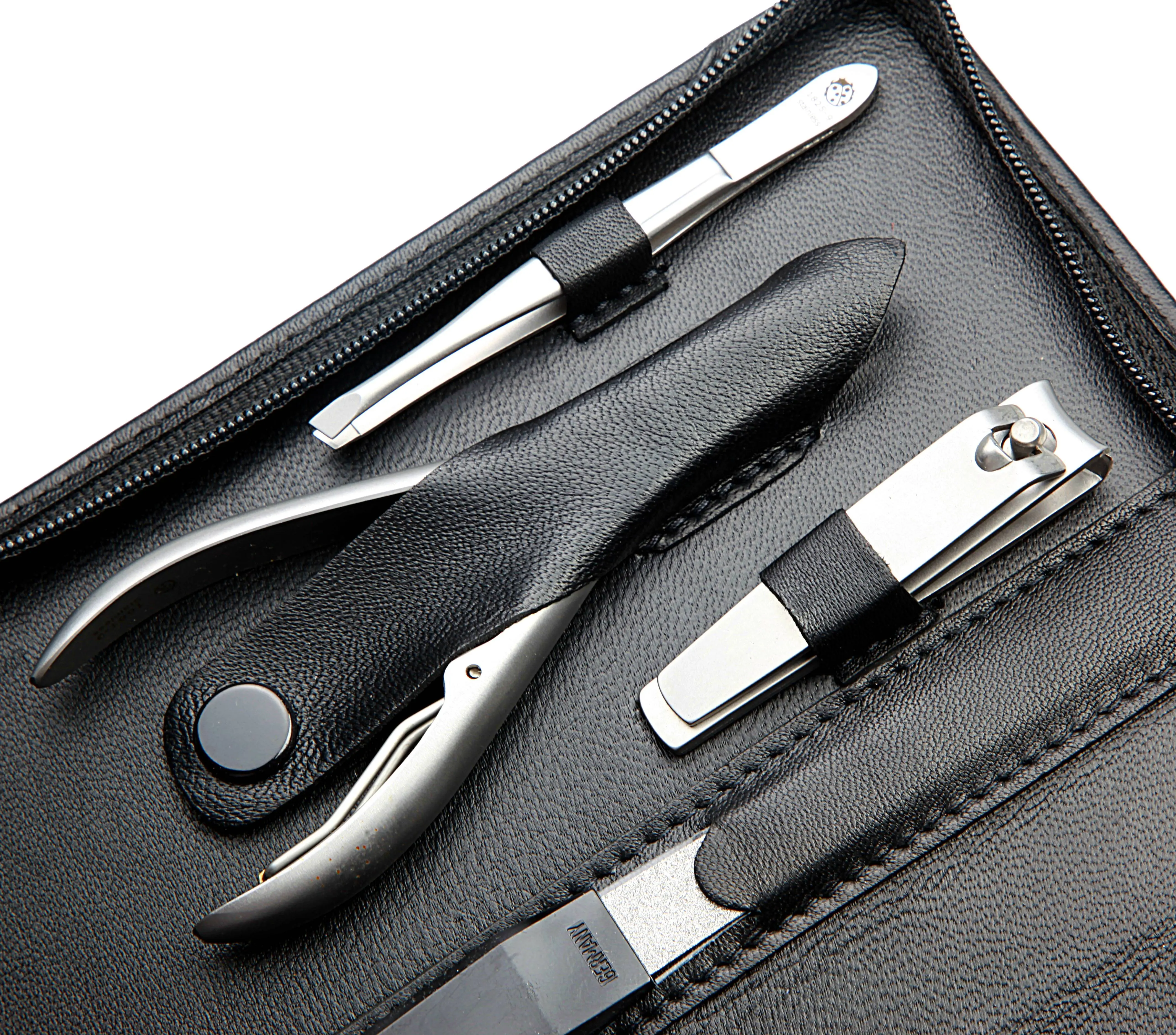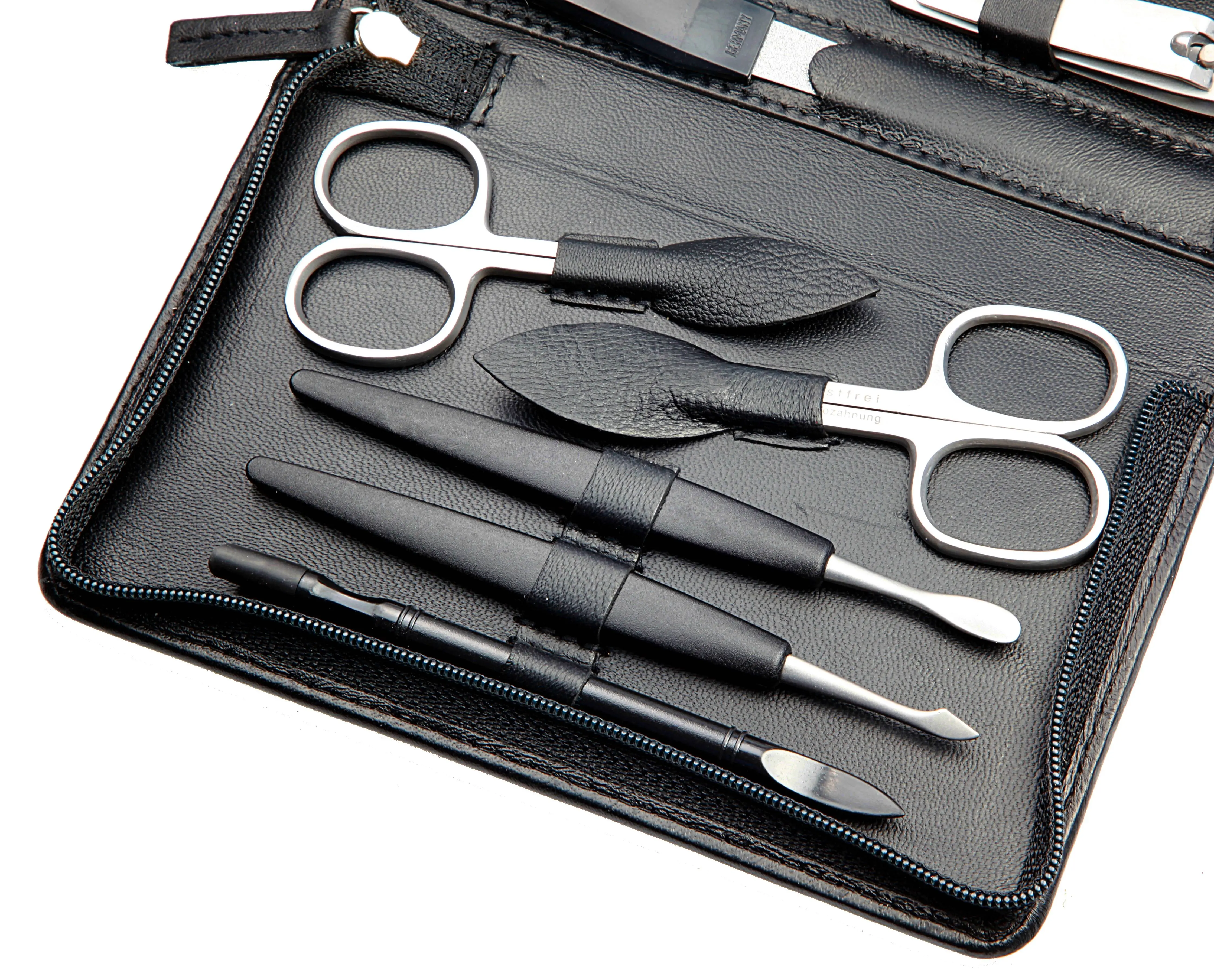 zippered manicure set: 9 implements, stainless steel, matt finish; nappa lambskin, black