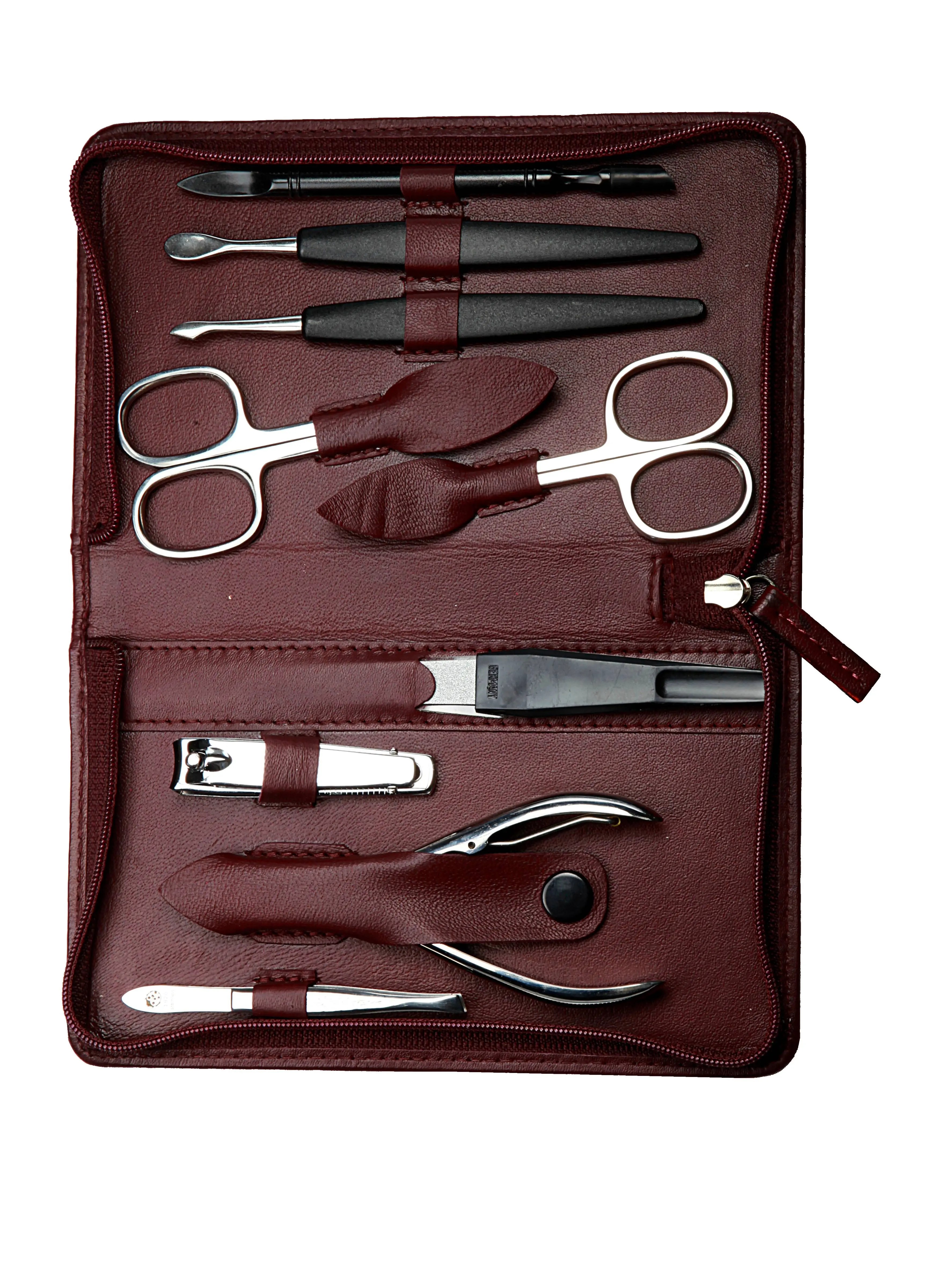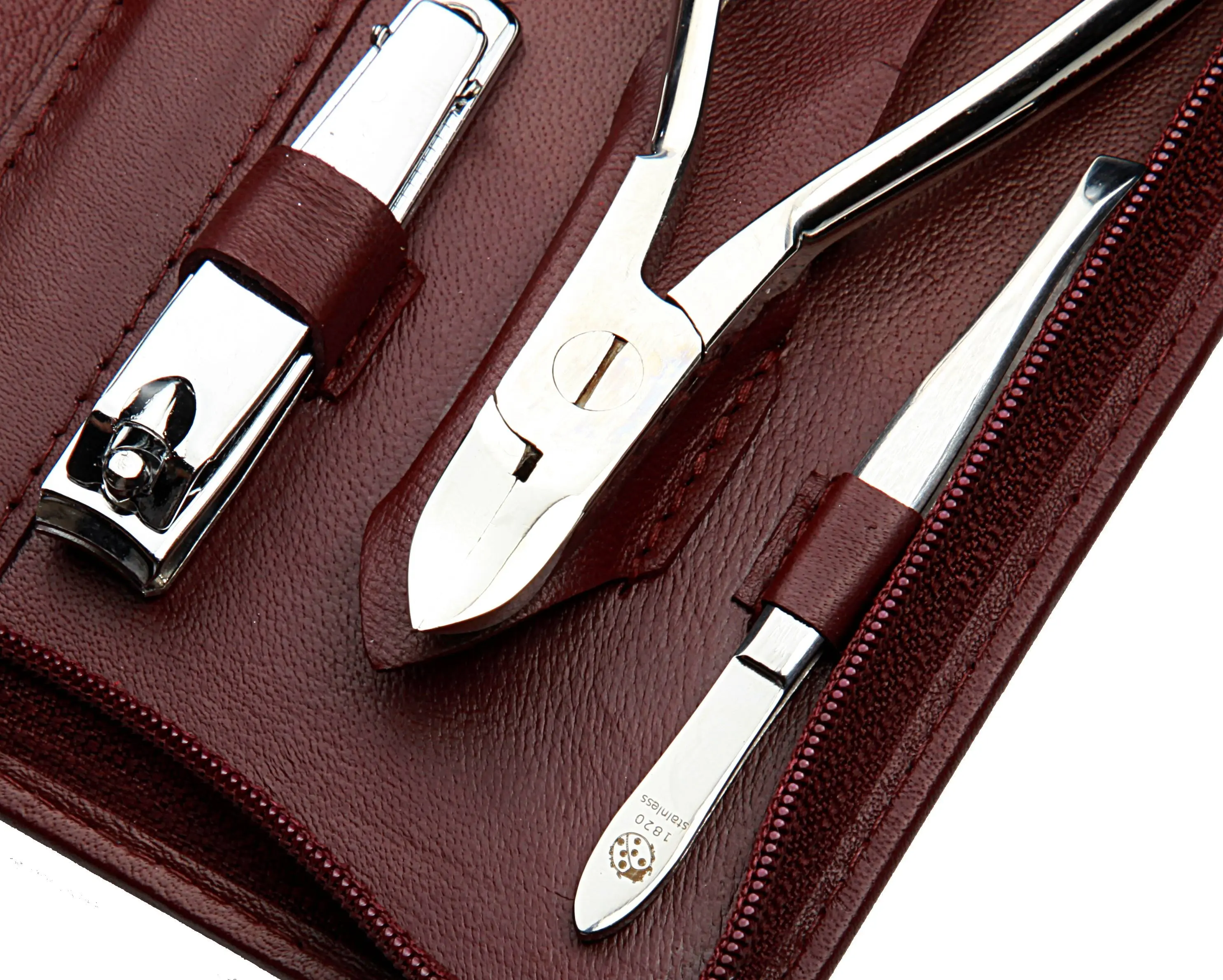 zippered manicure set: 9 implements, stainless steel, mirror polished finish; nappa lambskin, burgundy