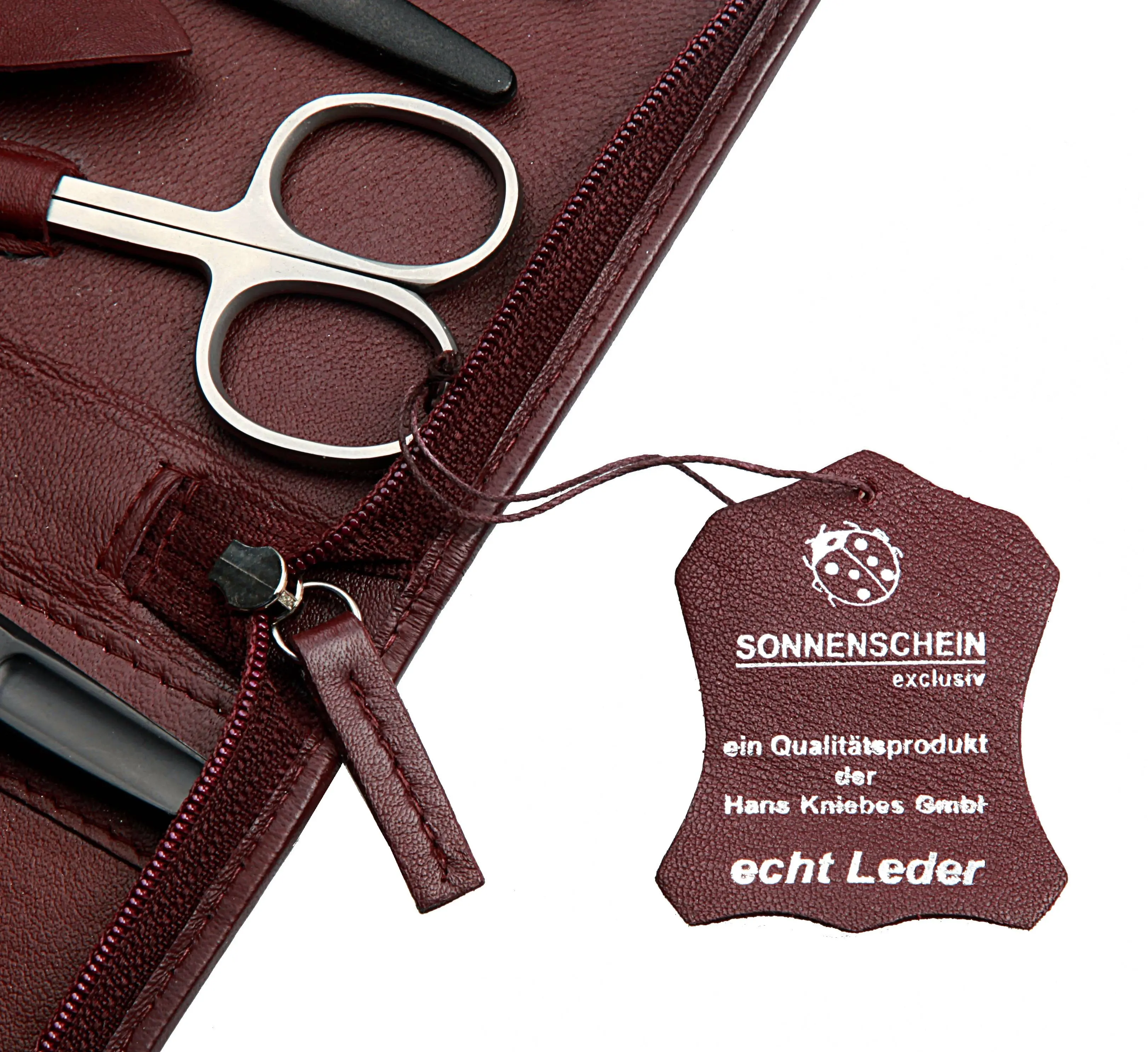 Classic, timeless, elegant: That is how to best describe this model from carefully crafted from a supple, burgundy nappa lambskin. The plain and practical case with a solid nylon zipper contains nine high end nailcare instruments in proven SONNENSCHEIN brand quality. They are skillfully crafted from stainless steel and come with a mirror polished finish: